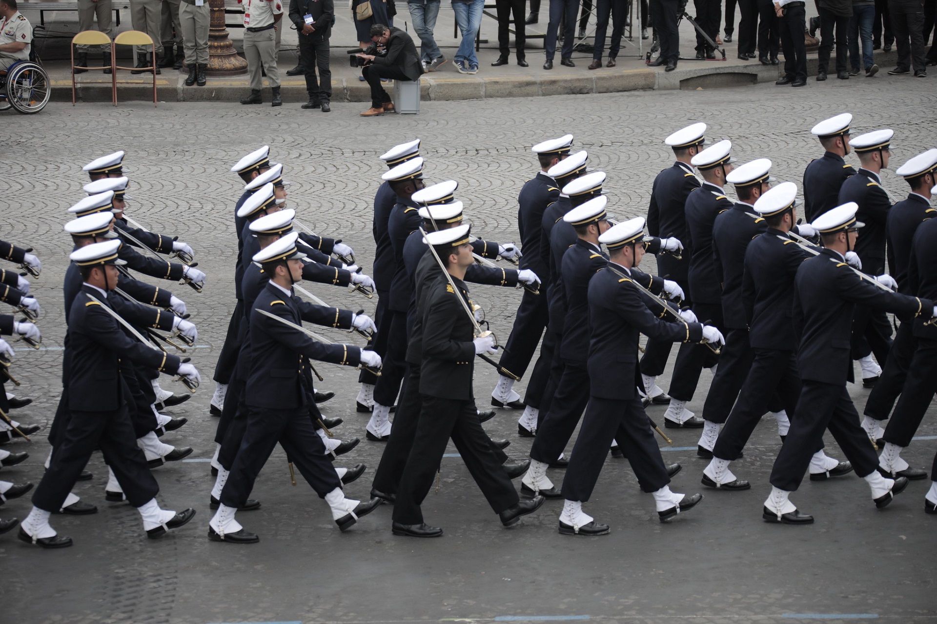 Dos guardamarinas españoles (en el centro de la imagen) desfilan junto a los cadetes de la Escuela de la Marina francesa en el 14 de Julio.