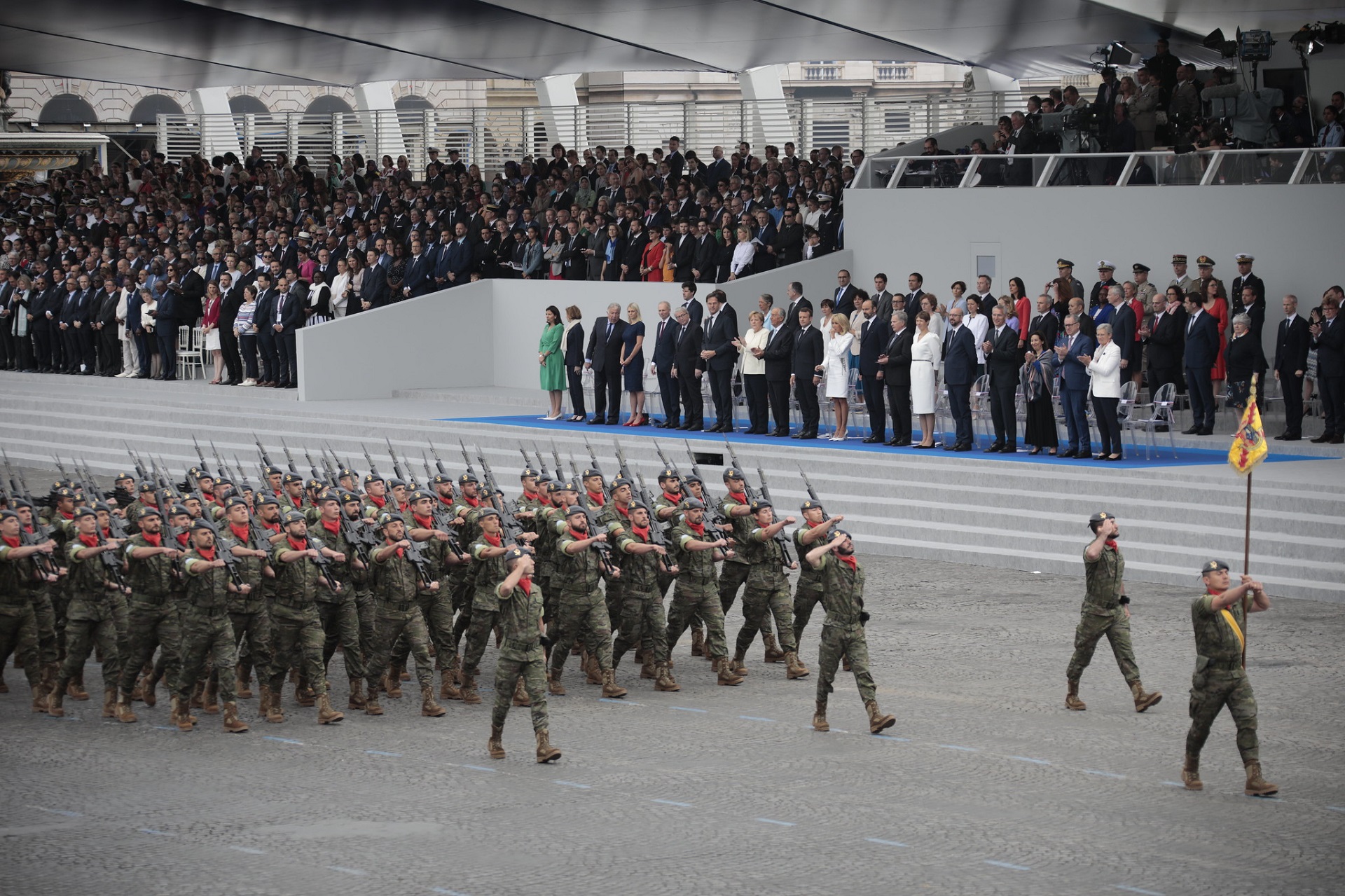 El Regimiento de Infantería "Príncipe" nº 3 del Ejército de Tierra pasa por la tribuna de autoridades en la Fiesta Nacional francesa.