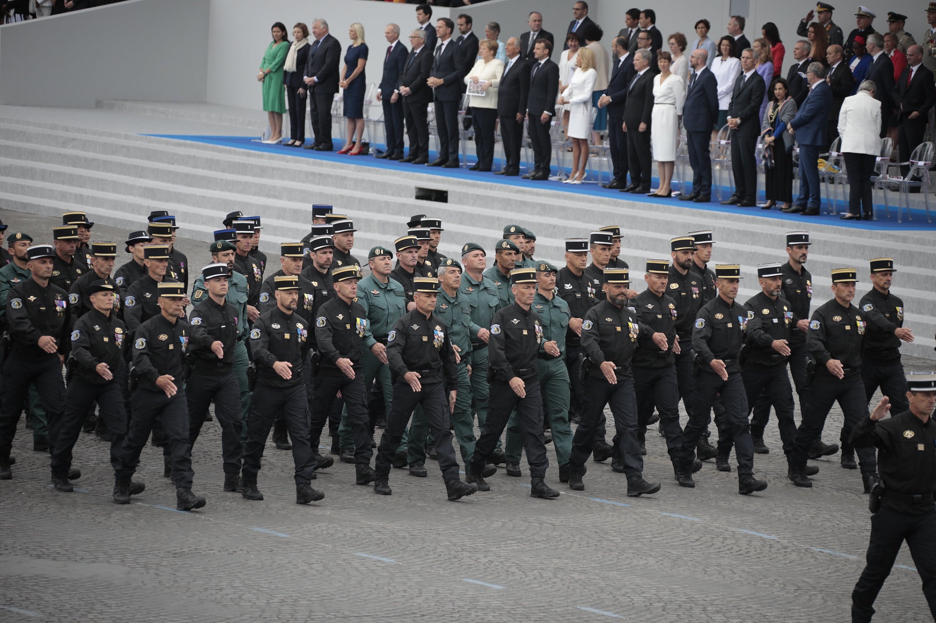 Efectivos de la Guardia Civil, exactamente, de los Grupos de Acción Rápida (GAR), desfilaron entre los efectivos de su cuerpo hermano, la Gendarmería francesa, durante el acto central del 14 de Julio.