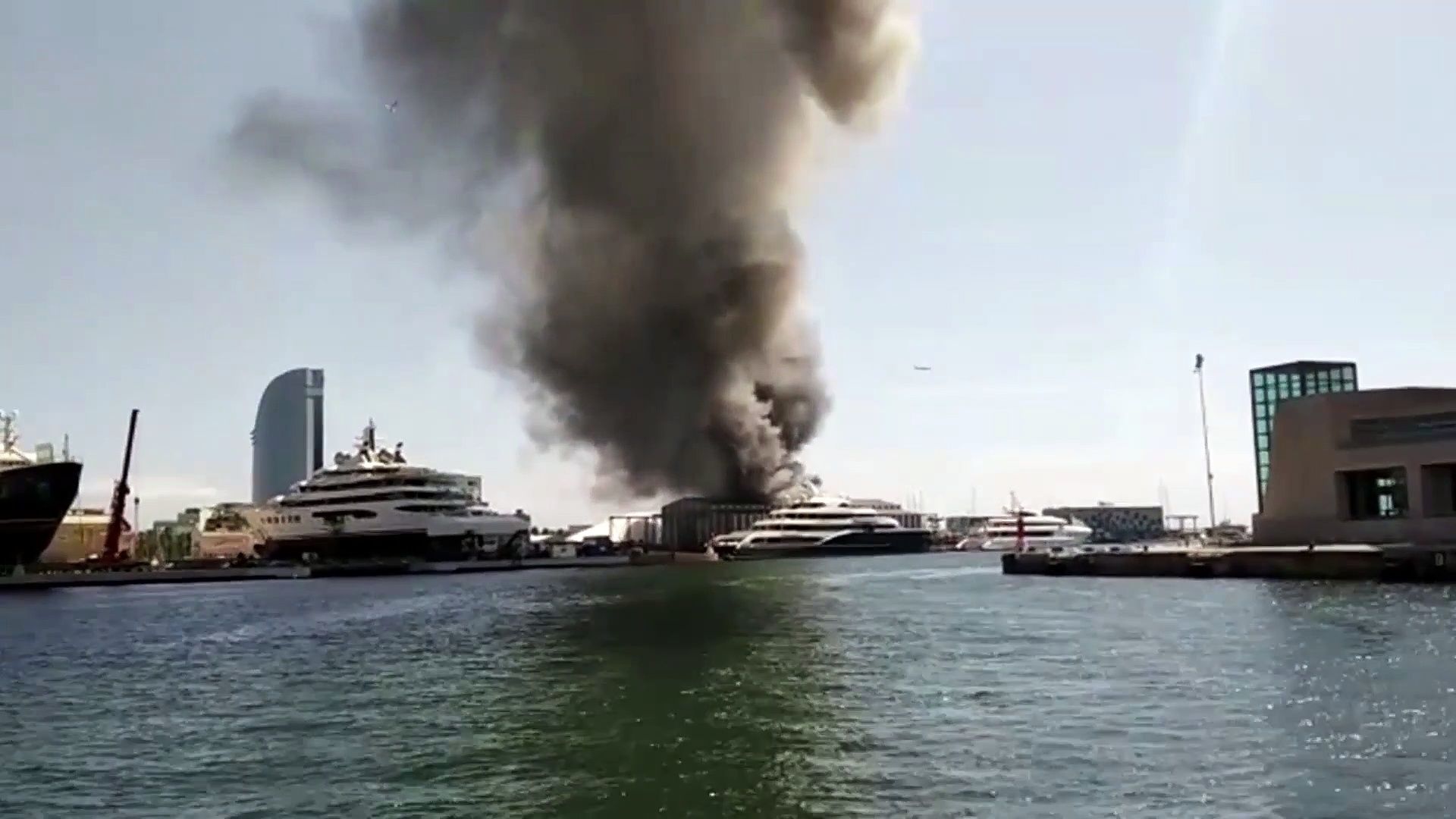 Imágenes de un incendio en la nave de la compañía Marina Barcelona 92 de reparación de barcos del puerto de Barcelona.
