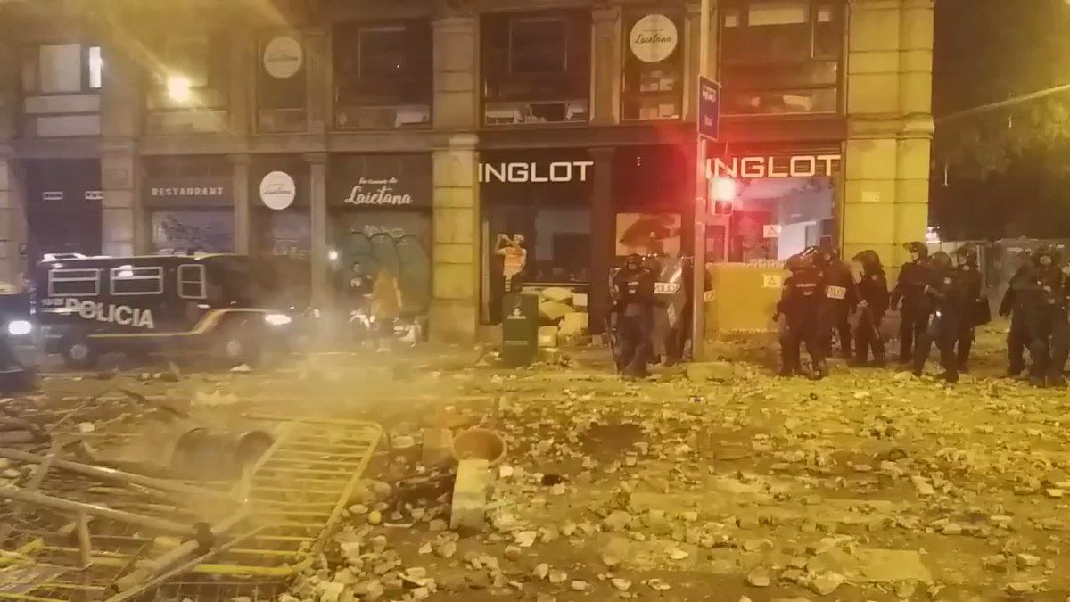 Varias decenas de furgones antidisturbios se han desplegado también por Urquinaona, la plaza de Universidad y Vía Layetana, donde los concentrados han levantado barricadas con contenedores de basuras volcados y han encendido hogueras en medio de la calzada, tras las que se parapetaban para arrojar objetos a la línea policial.