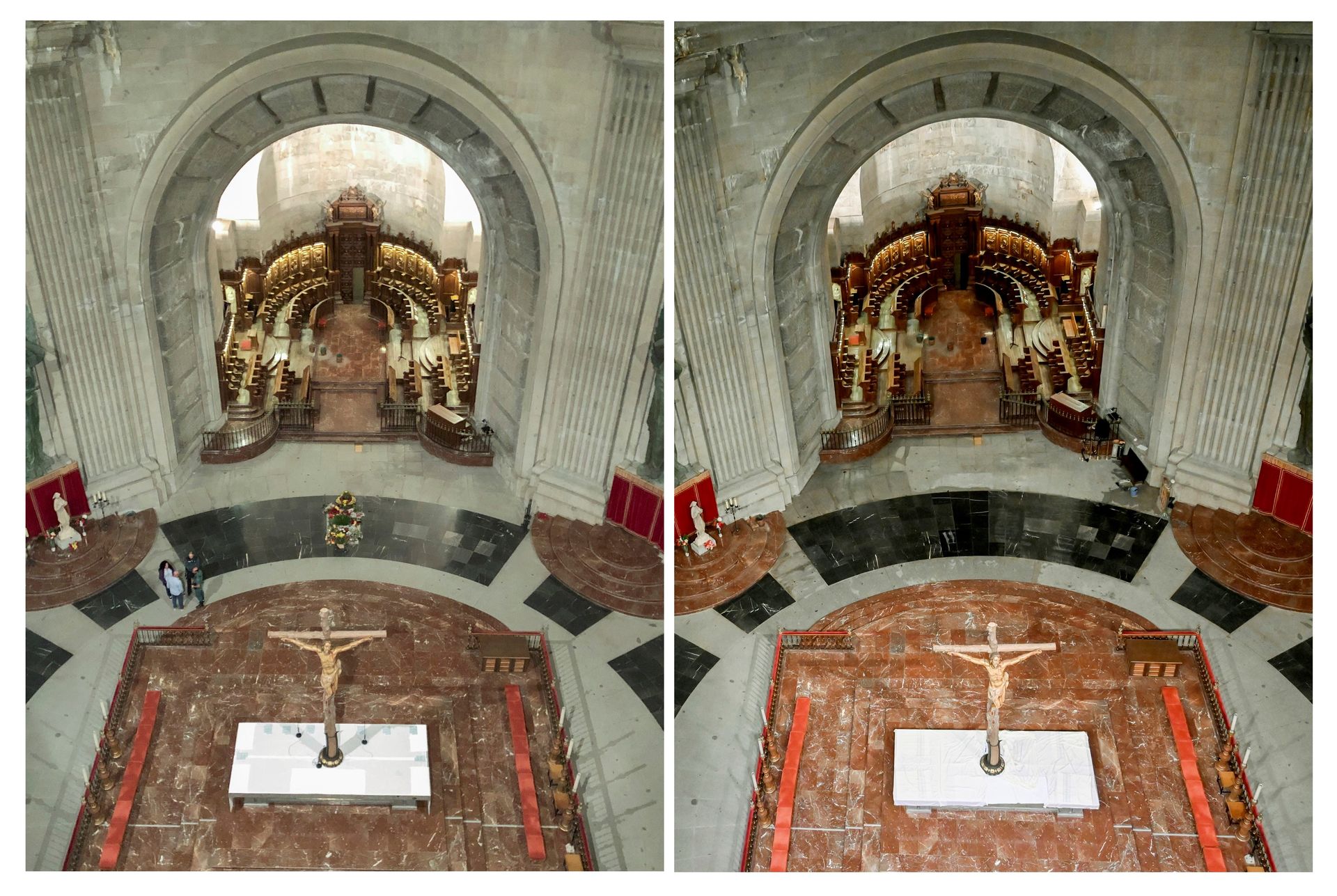 Estado actual de la basílica del Valle de los Caídos y su comparación con la imagen anterior a la exhumación de Franco.