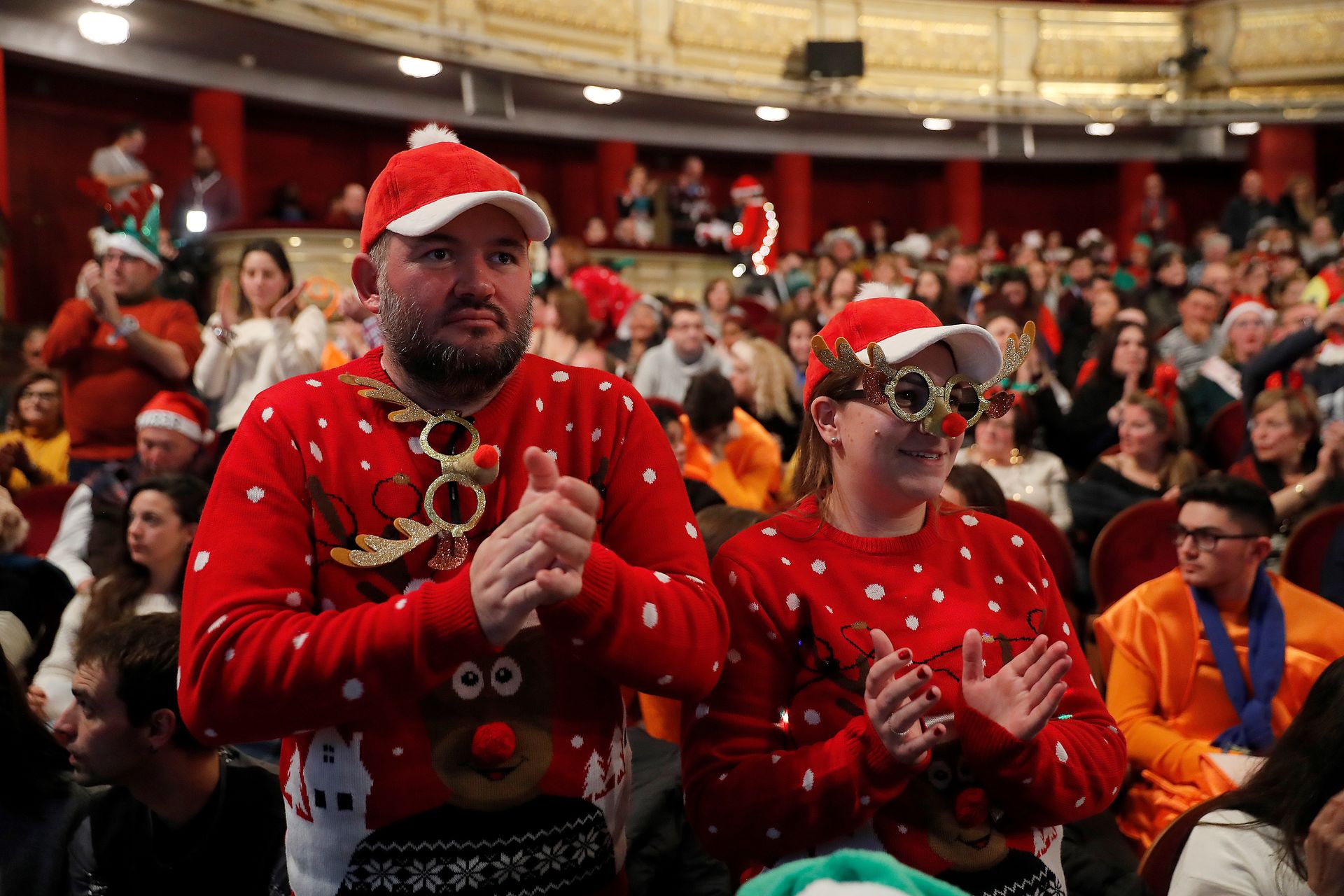 Dos personas aplauden durante el Sorteo Extraordinario de la Lotería de Navidad celebrado este domingo en el Teatro Real.