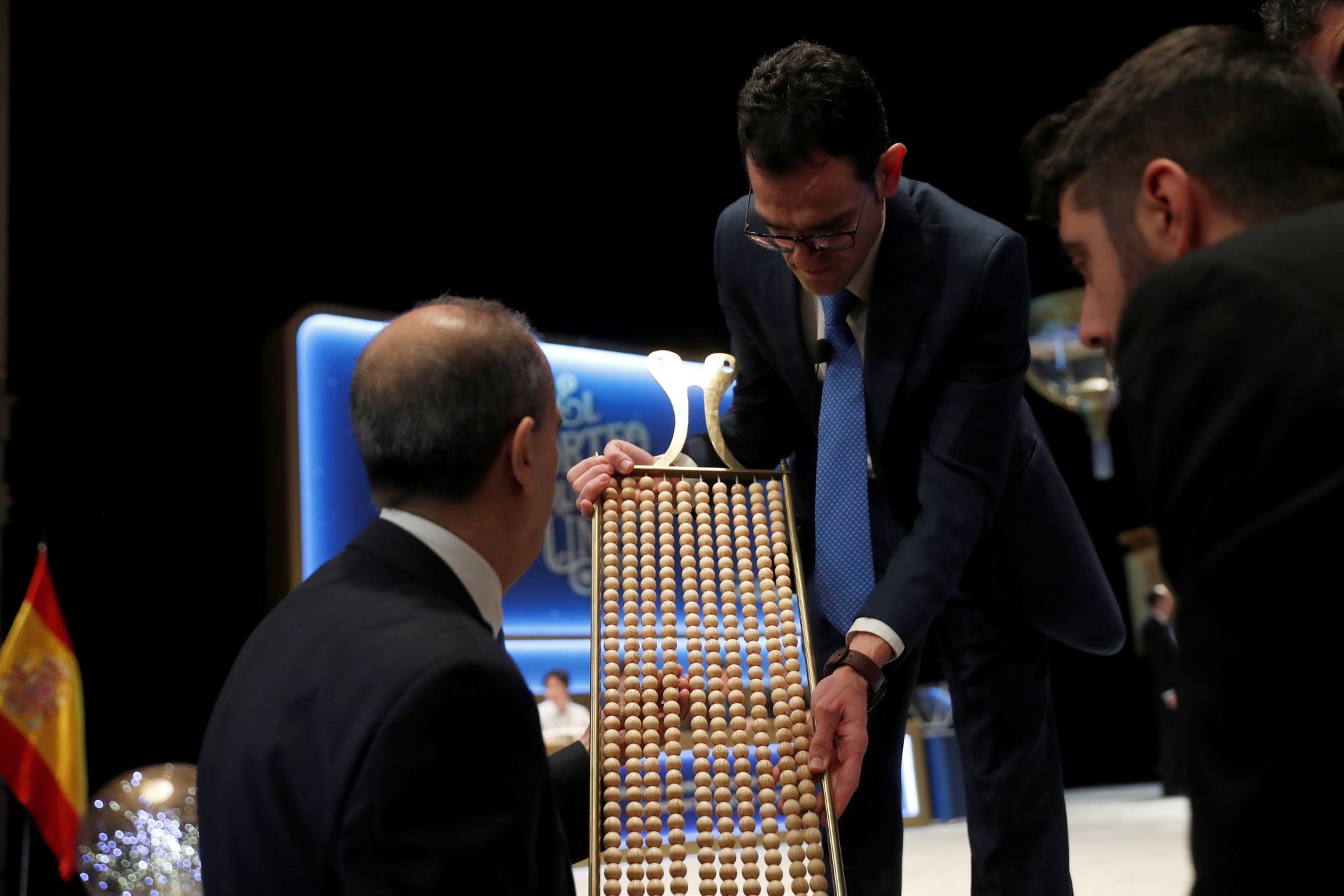 Los operarios revisan los números en el Teatro Real antes de empezar a repartir la suerte de la lotería