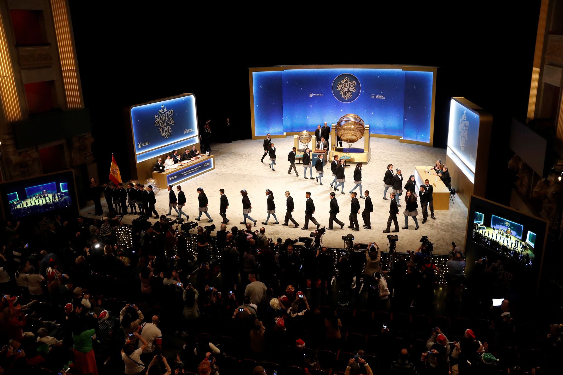 Varios niños del colegio de San Ildefonso momentos antes de que empiece en el Teatro Real el sorteo más esperado del año.