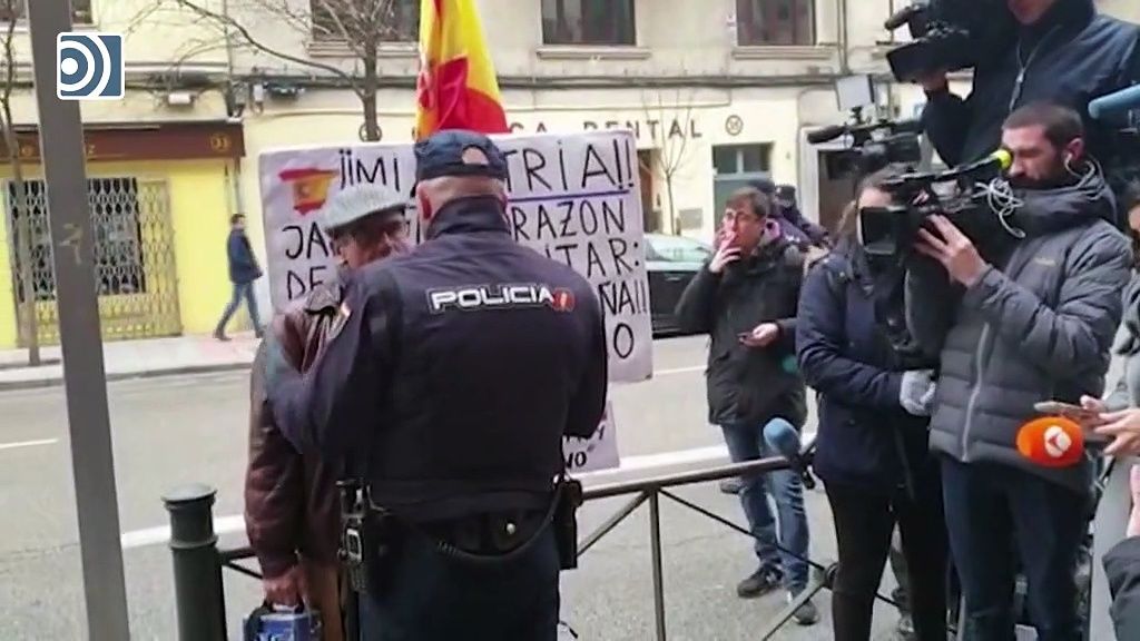 Tres policías han arrastrado al hombre por la acera hasta retirarlo de la entrada de la sede donde portaba una pancarta en la que podía leerse: "Jamás mi corazón dejará de gritar por la unidad de España" y con un reproductor en el que sonaba el himno nacional.