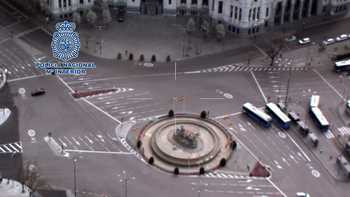 La Policía Nacional ha publicado en su cuenta de Twitter un impaciente vídeo mostrando, desde helicóptero, el centro de Madrid prácticamente vacío durante el primer día del estado de alerta.