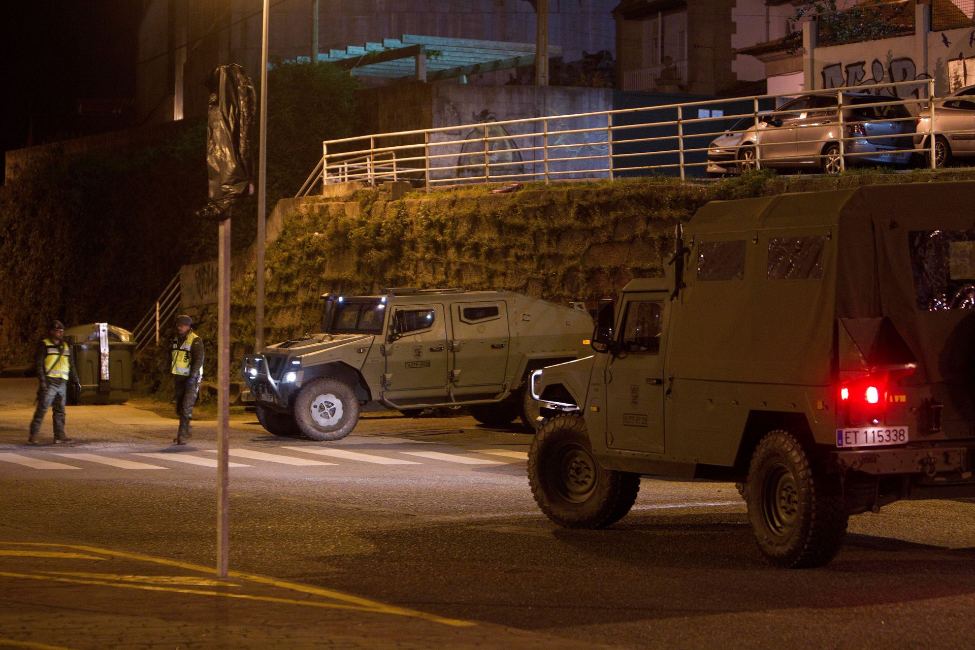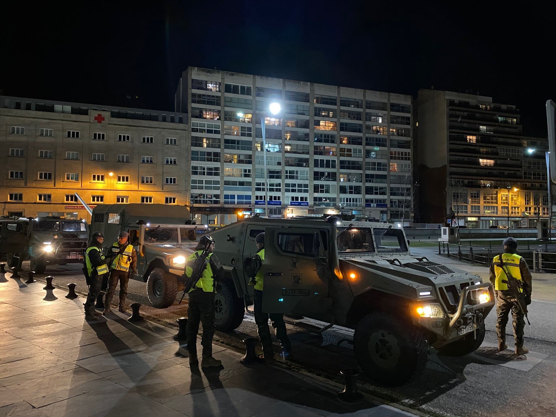 Miembros de la Brigada Galicia VII (BRILAT) patrullan la calles de Vigo tras la alerta sanitaria en Galicia, promulgada por el Presidente del Gobierno, a causa de la crisis del coronavirus.