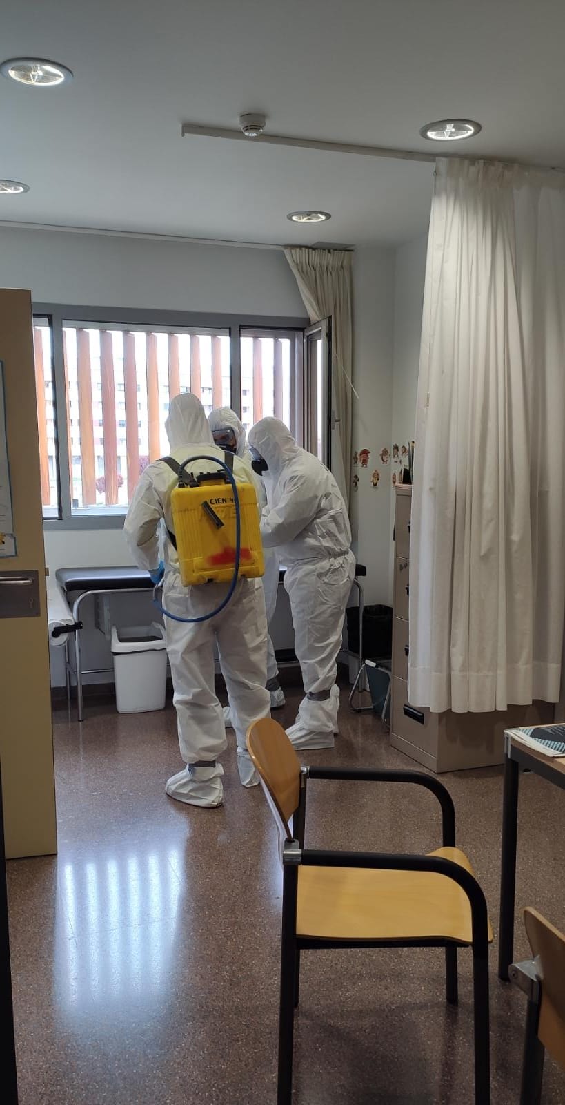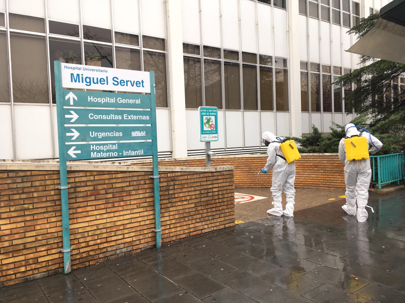 Efectivos de la Unidad Militar de Emergencias desinfectando el hospital de Haro (La Rioja).
