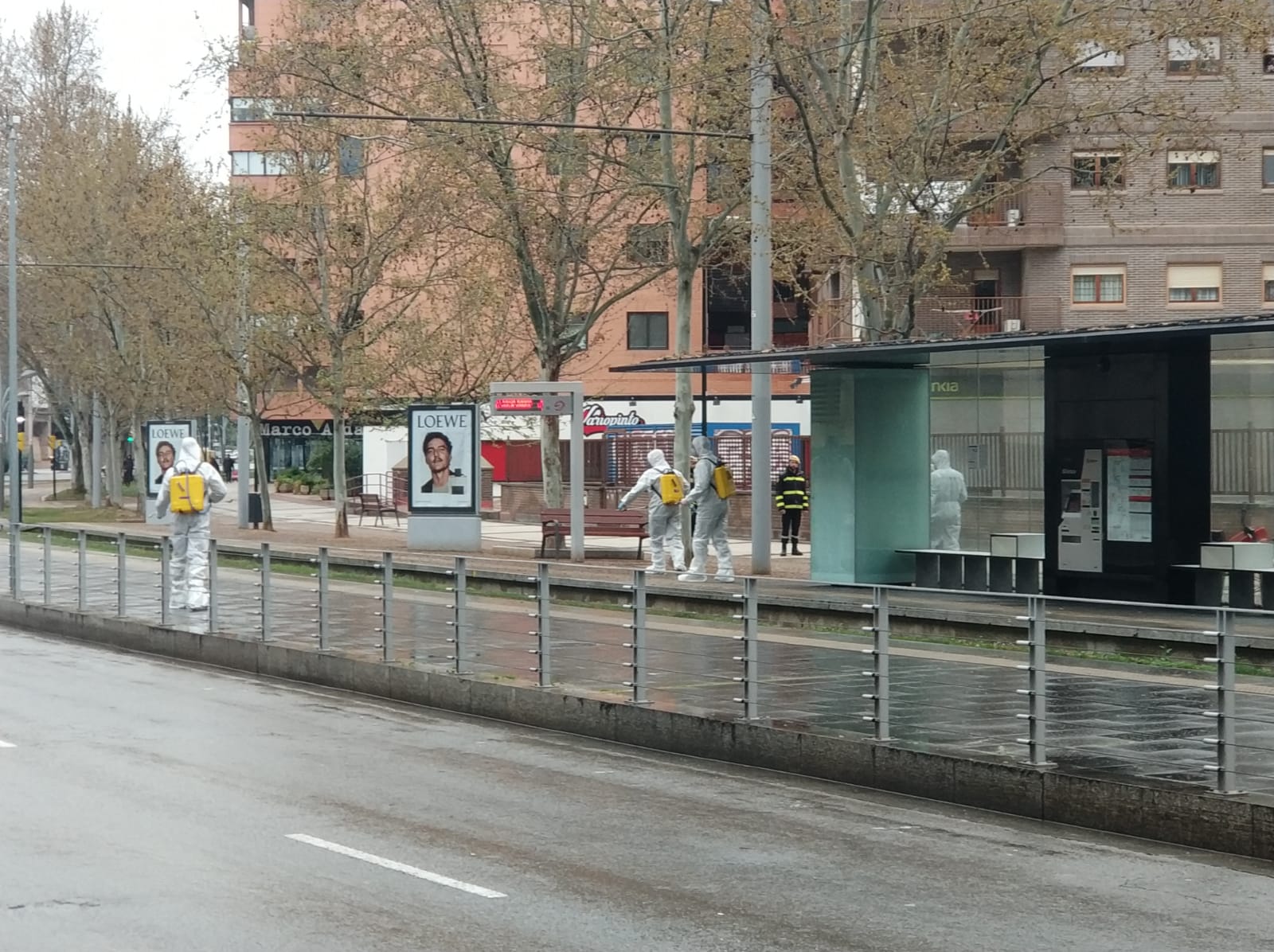 Efectivos de la Unidad Militar de Emergencias trabajando en Zaragoza. Han desinfectado la estación de trenes, el hospital Miguel Servet y varias marquesinas de autobús.