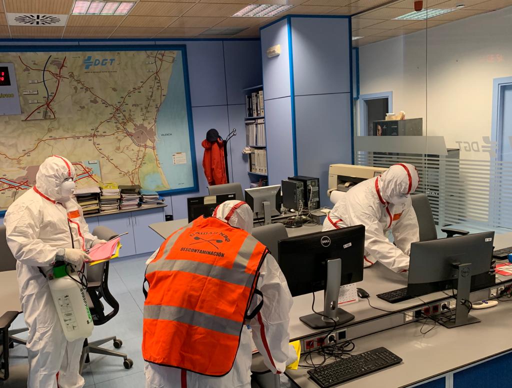 Regimiento NBQ del Ejército de Tierra en las calles de Valencia y procediendo a la desinfección de la sede de la DGT en la capital del Turia.