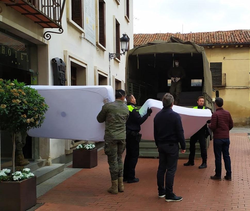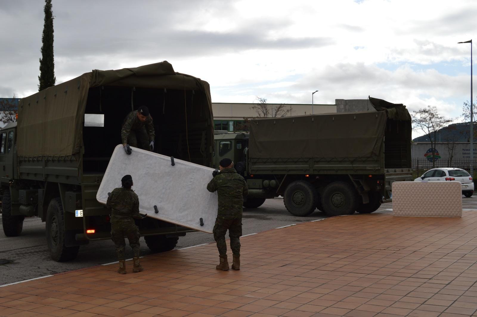 Imágenes de militares de la Brigada Paracaidista (BRIPAC) del Ejército de Tierra trasladando camas cedidas por hoteles hasta el Hospital de Alcalá de Henares (Madrid).