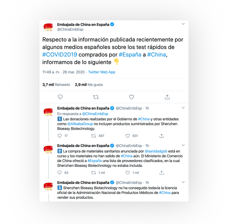 Y añaden: "El Ministerio de Comercio de China ofreció a España una lista de proveedores clasificados, en la cual Shenzhen Bioeasy Biotechnology no estaba incluida". Y no estaba incluida porque, según informan, esta empresa "no ha conseguido todavía la licencia oficial de la Administración Nacional de Productos Médicos de China para vender sus productos".