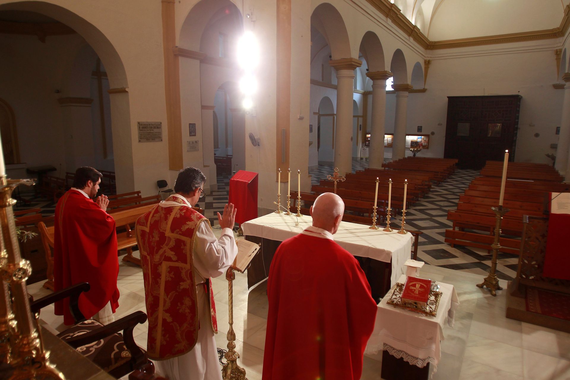 Misa del domingo de ramos que se ha celebrado sin gente y a puerta cerrada en la iglesia de la Palma en Algeciras (Cádiz). Con motivo del estado de alarma que se encuentra el país por la pandemia del coronavirus.