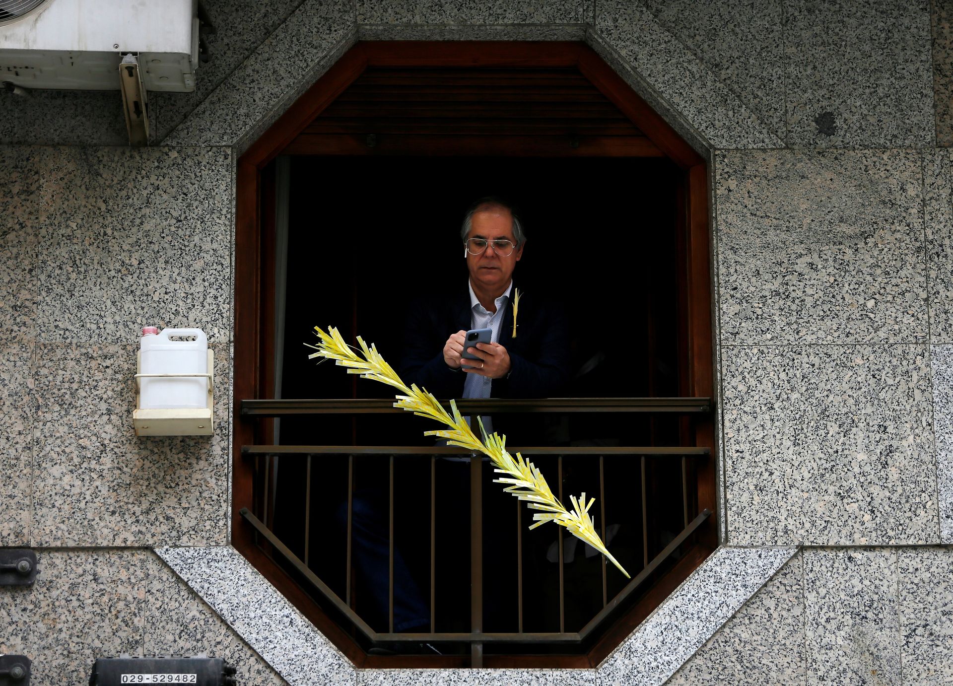 Vecinos de Elche decoran sus balcones con improvisadas palmas y salen a aplaudir en el momento en el que redoblan las campanas por el Domingo de Ramos.