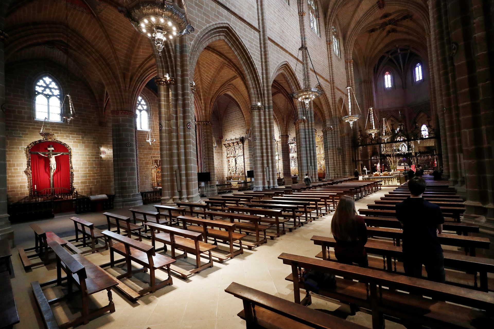 El arzobispo de Pamplona y obispo de Tudela Francisco Pérez, durante la celebración de la misa del Domingo de Ramos en la Catedral de Pamplona con un reducido número de presbíteros, diáconos, acólitos y algunos fieles.