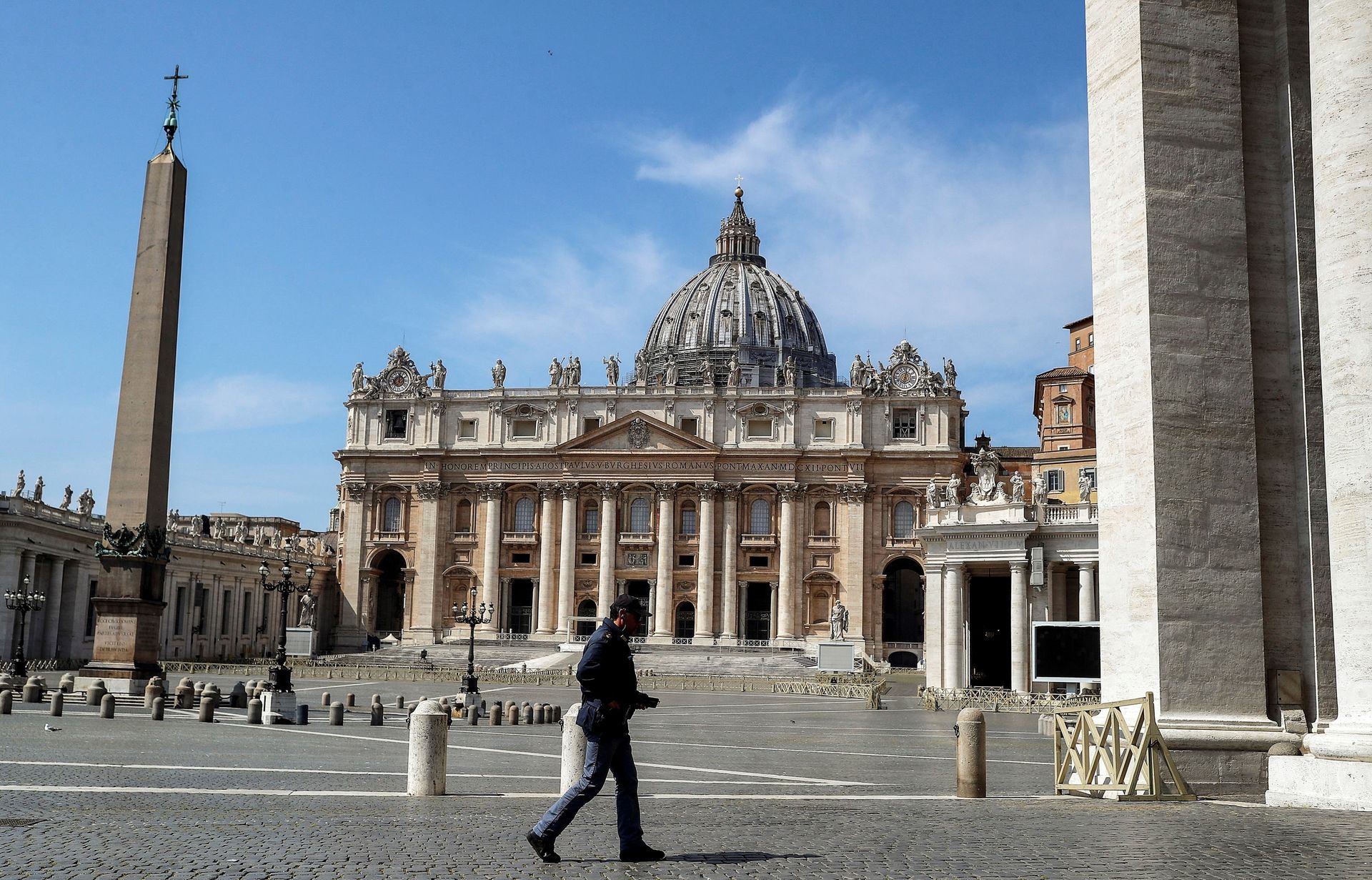 Un agente de policía patrulla por una desierta plaza de San Pedro (Vaticano) durante el Domingo de Ramos.