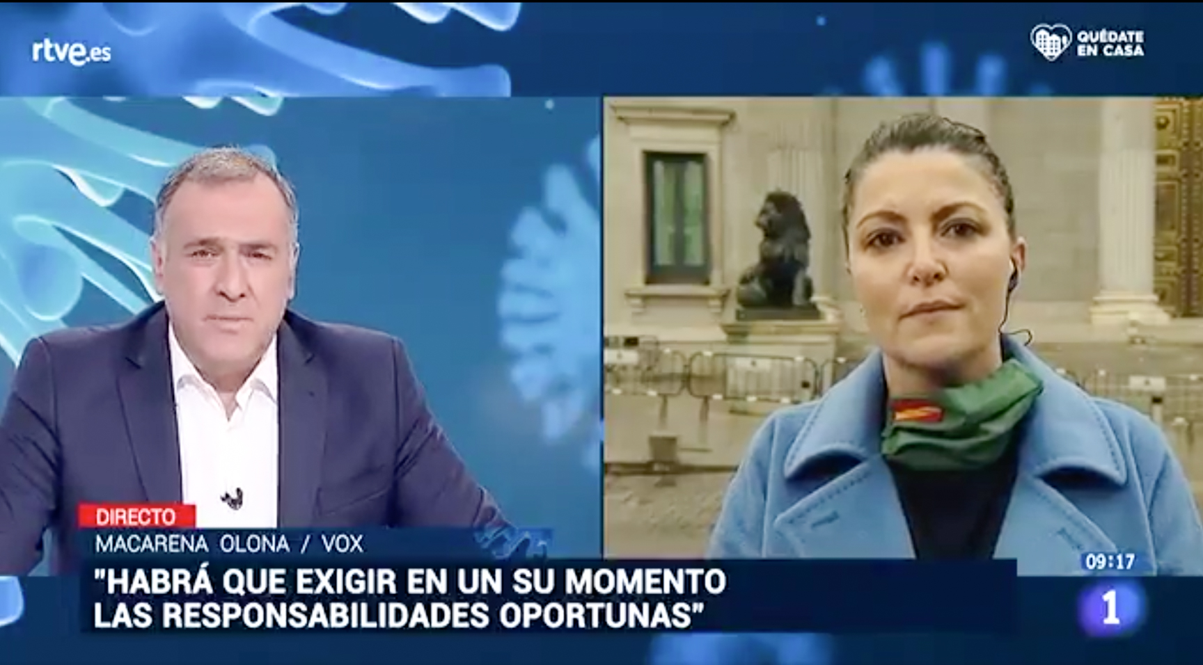 Cuando estaba siendo entrevistada, la diputada de Vox ha aprovechado para denunciar que TVE está "coadyuvando al adoctrinamiento, a silenciar el dolor y a la deshumanización de la muerte". Algo que considera una "auténtica vergüenza" que se está llevando a cabo "con el dinero de todos los españoles". En este sentido ha criticado duramente le programa de humor emitido por la cadena sobre el confinamiento.