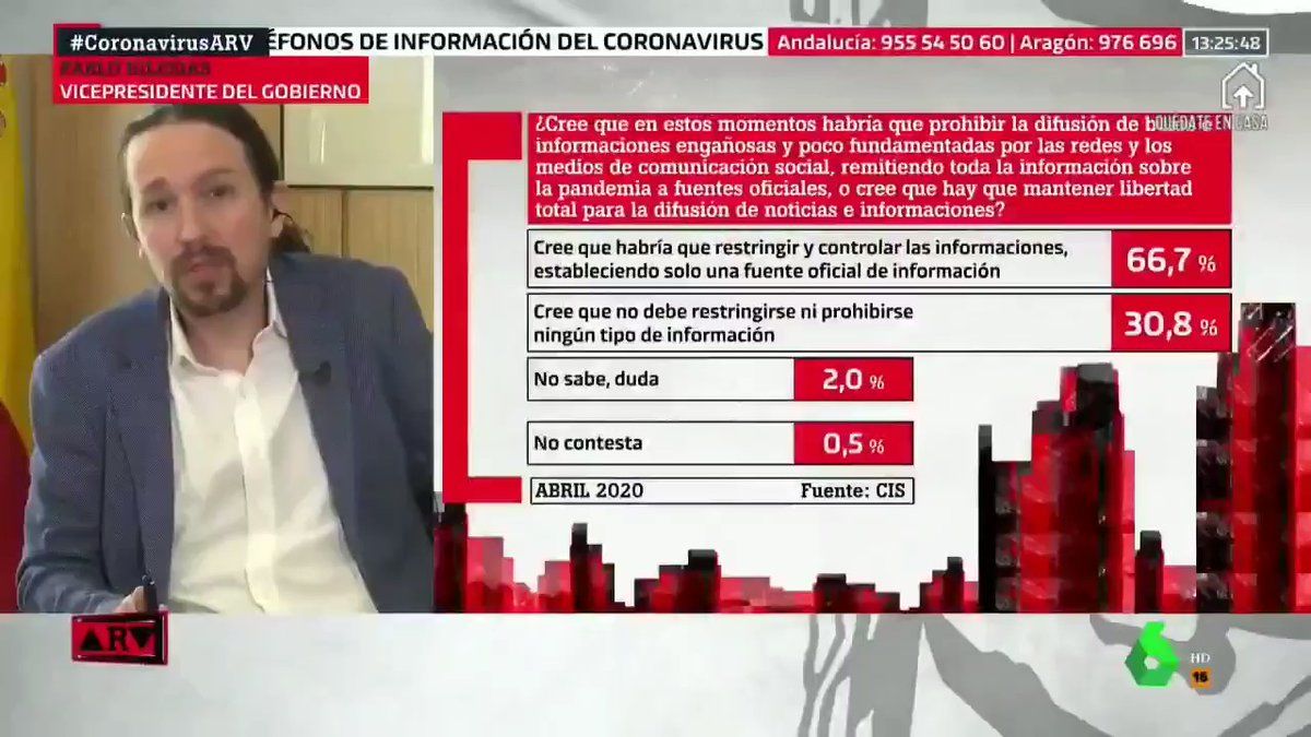 Entrevistado por Antonio García-Ferreras en su programa de La Sexta el político bolivariano que ocupa la vicepresidencia del Gobierno social-comunista de España ha dejado bien clara su intención de imponer la censura contra los medios libres y críticos con el Gobierno.
