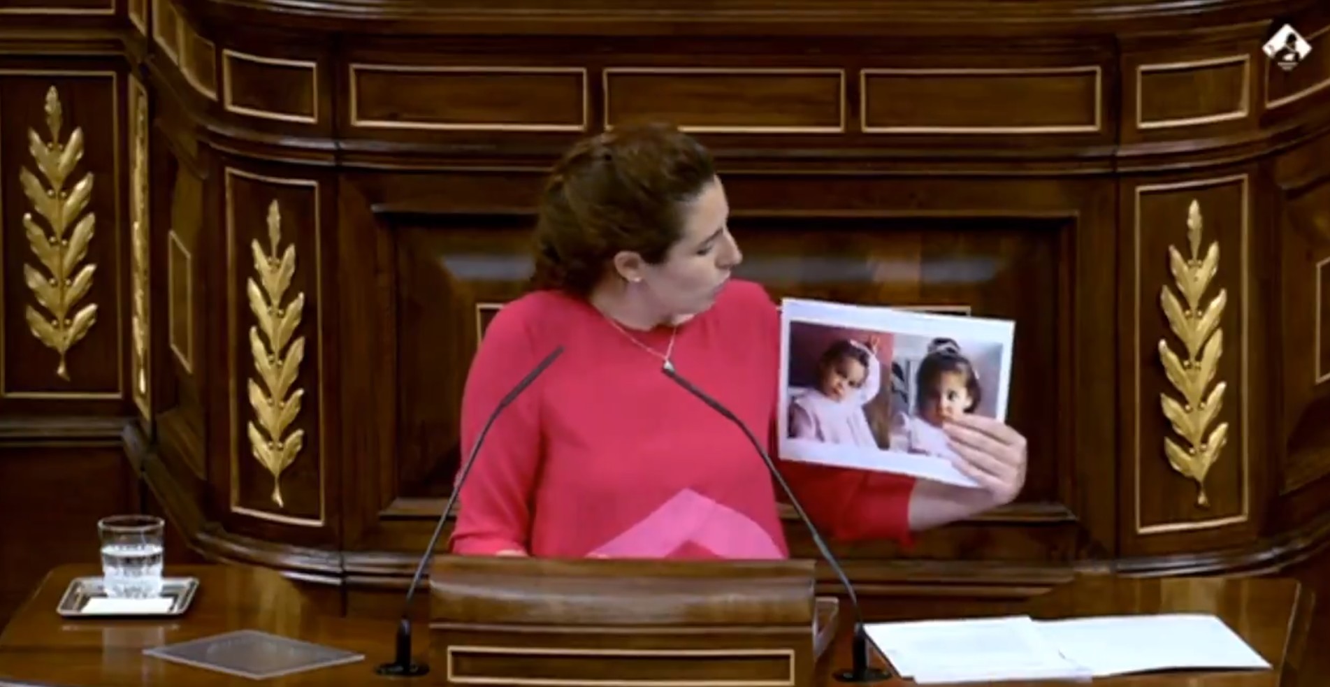 "Para Rufián dos niñas verdaderamente robadas" son "un comodín", espetó la diputada del partido de Santiago Abascal enseñando las fotografías de las sobrinas de su compañero de filas Francisco José Alcaraz, que fueron brutalmente asesinadas por ETA en el atentado de la casa cuartel de la Guardia Civil en Zaragoza.