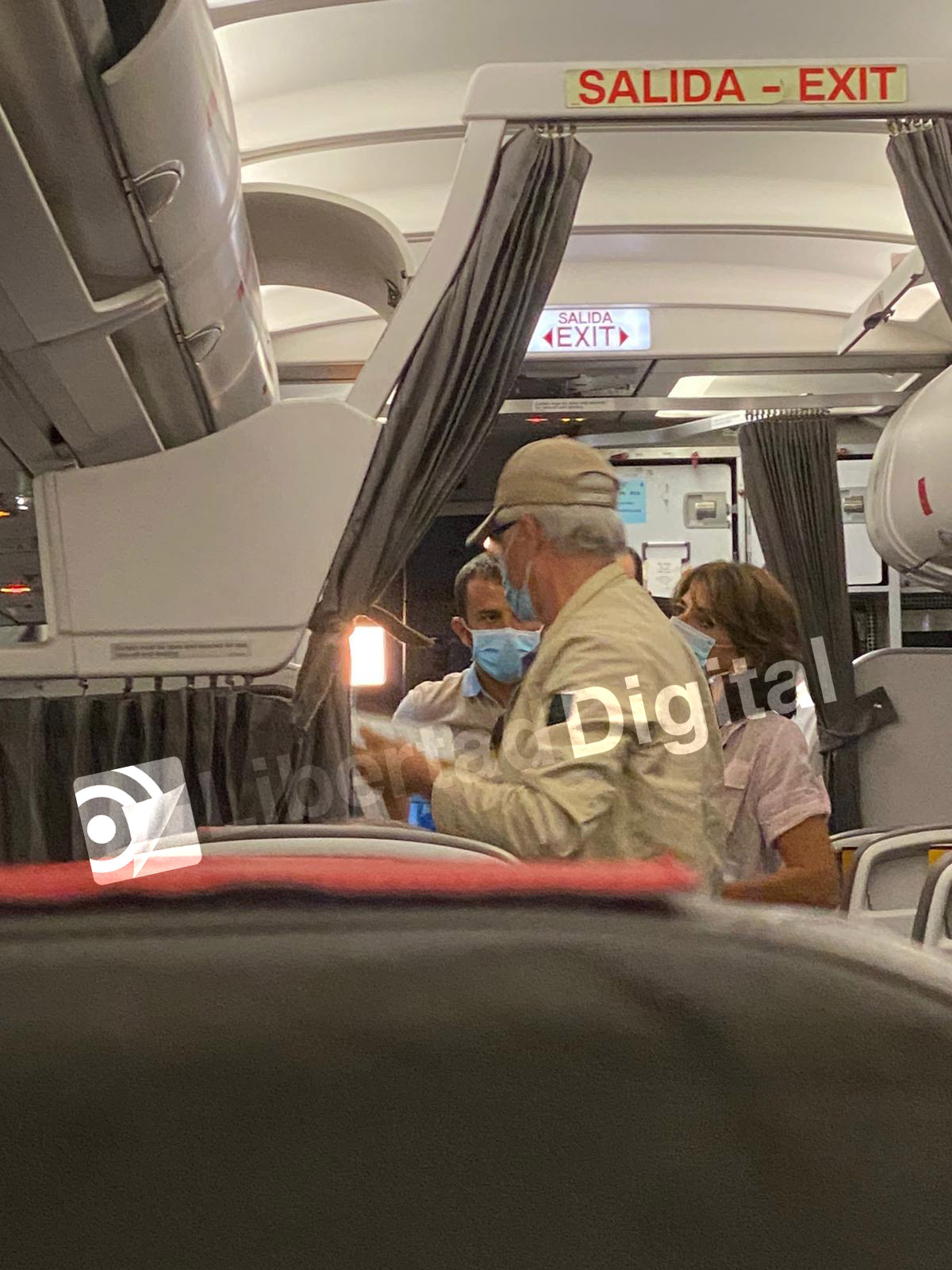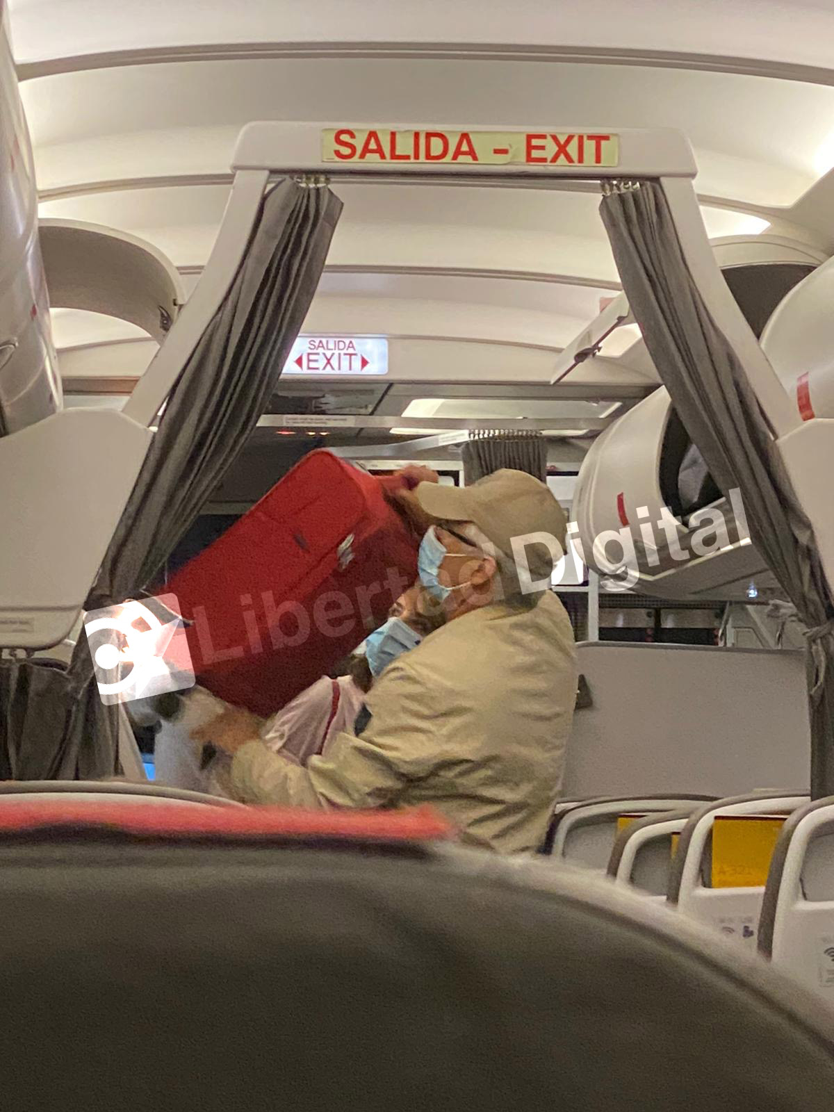 Baltasar Garzón coloca su maleta en el compartimento del avión.