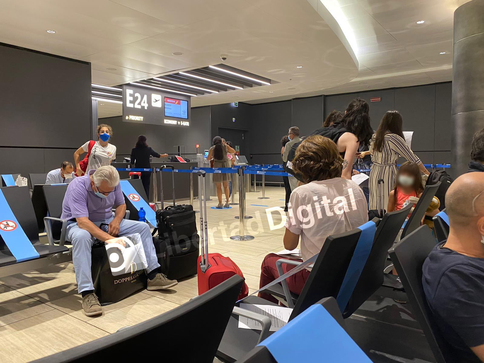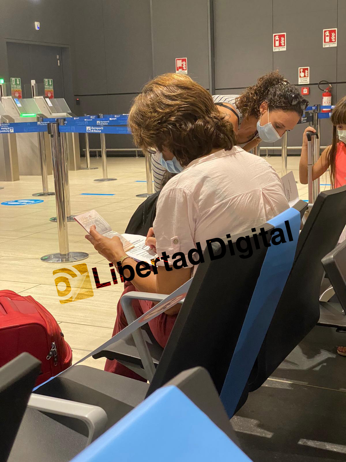Dolores Delgado esperando a que se abran las puertas de embarque.