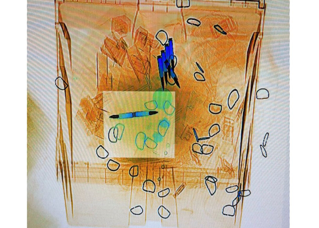 Entre los aspectos que más han llamado la atención del sindicato, destaca el hecho de que la alerta visual que advertiría a los vigilantes cuando un objeto sospechoso pasa por el escáner —el recuadro más claro que se percibiría en la imagen— tan sólo aparezca en los dos cartuchos de la parte inferior y no en los de la parte superior. Tal y como explica la experta a LD, esta alerta salta "cuando se detecta un alto volumen de concentración metálica", por lo que, con mayor razón, debería aparecer otro recuadro sobre los cinco cartuchos de arriba.
