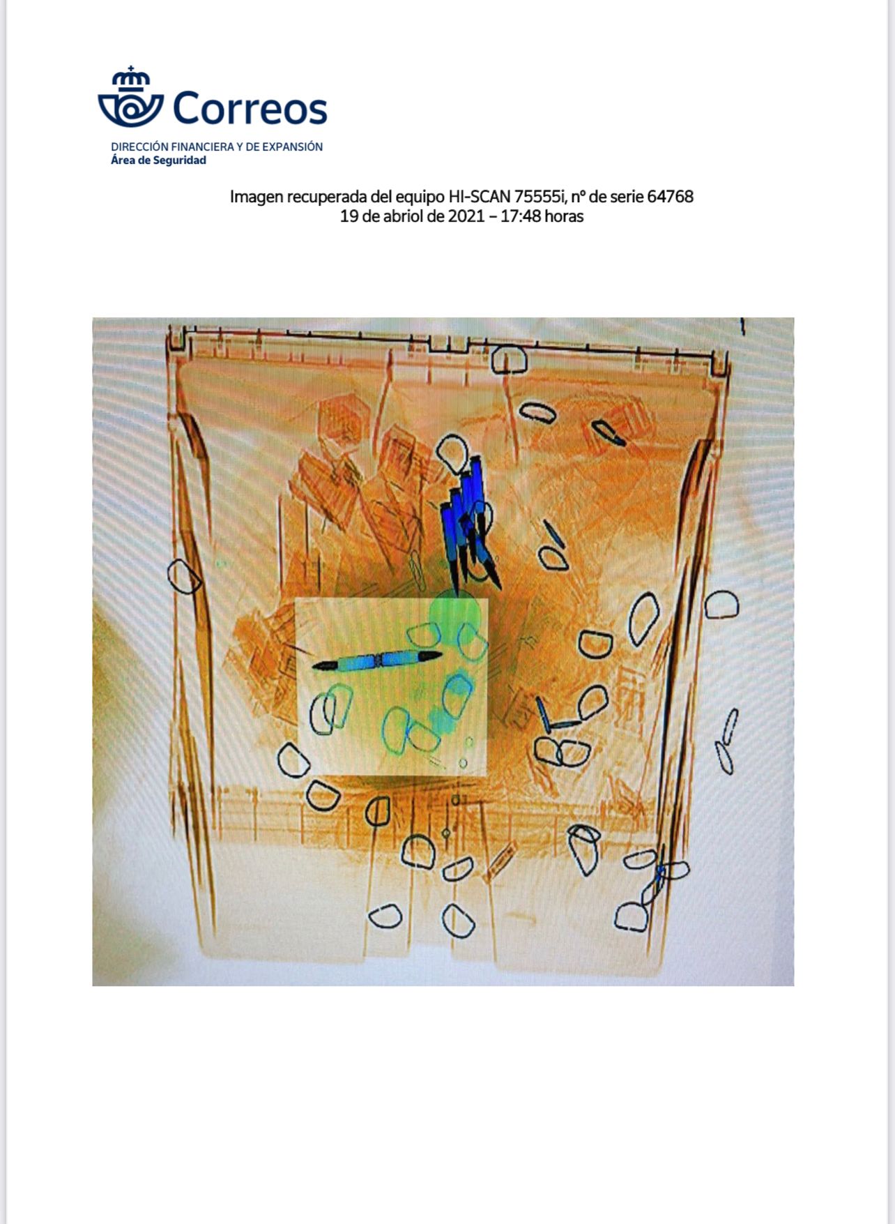En la conversación mantenida en la mañana de este lunes, este periódico también se ha interesado por conocer su versión sobre las erratas que contiene la imagen del escáner facilitada por la SER y que habrían servido para alimentar las sospechas: en la fecha pone "abroil" en vez de abril, en la referencia del escáner (Hi-SCAN 75555i) sobra un número 5 y, según algunos usuarios de Twitter, en una primera versión, el logo de Correos no llevaba la cruz que habitualmente se puede ver en la parte superior del mismo.