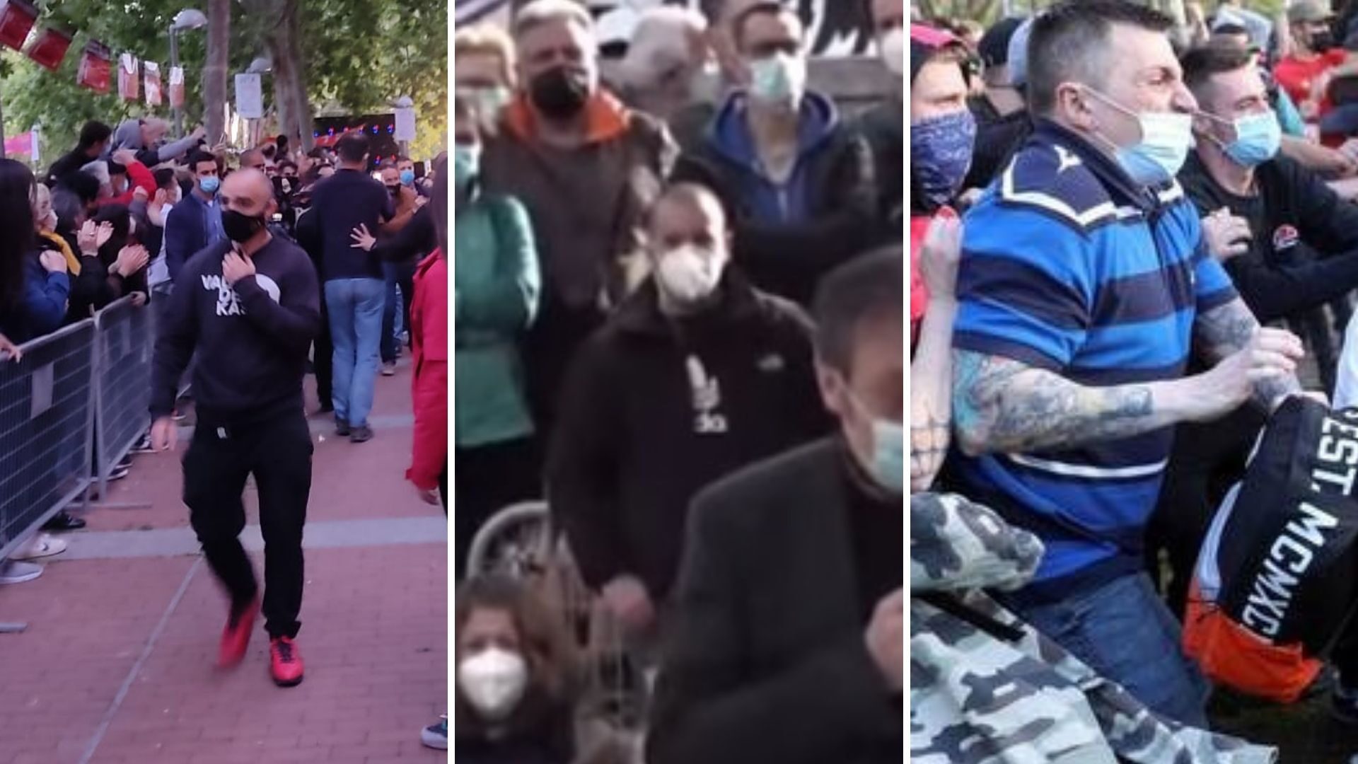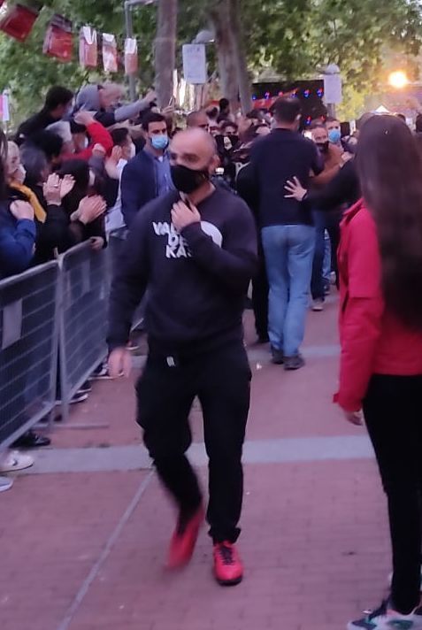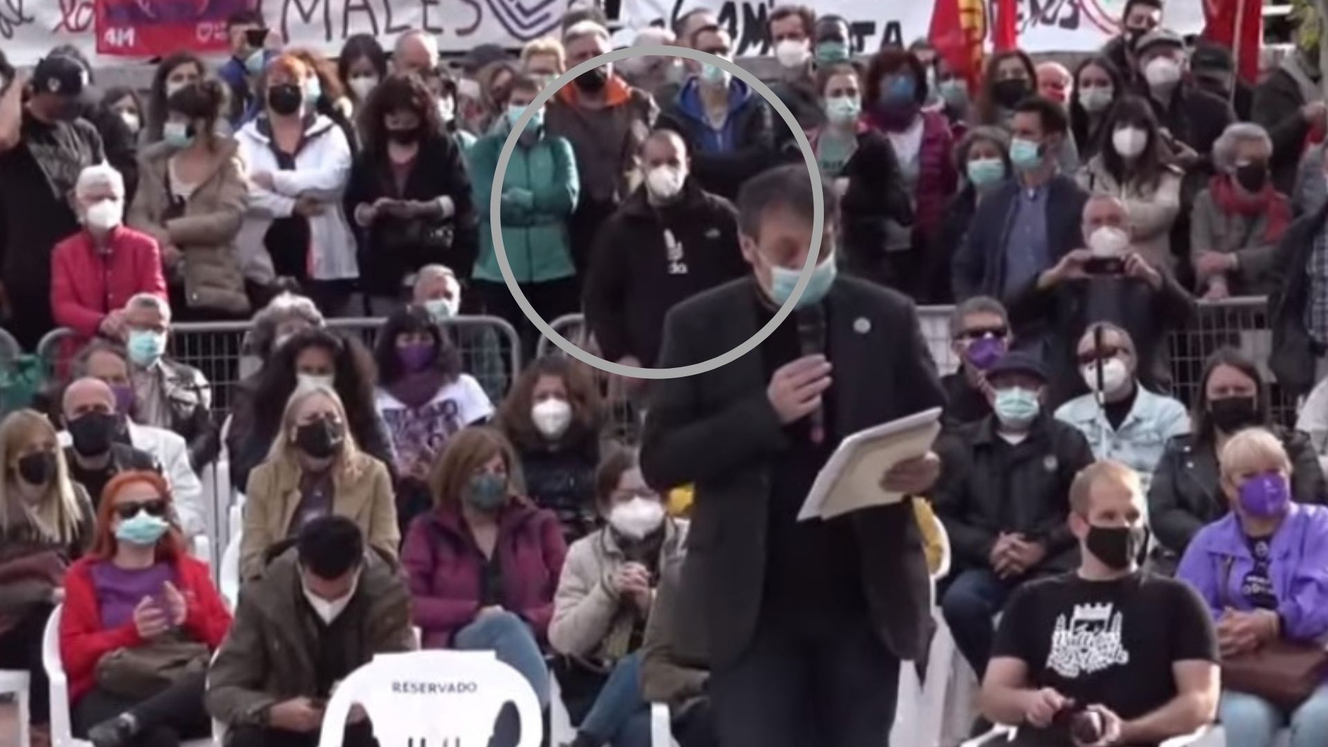 El hombre de deportivas rojas y sudadera con el lema "Valle del Kas" que se ve en la imagen es Erlantz Ibarrondo, un abogado vinculado a organizaciones de extrema izquierda, según la identificación realizada por El Confidencial. Durante el acto de Unidas Podemos del pasado 30 de abril en Vallecas, se encargó del control de accesos a la zona vallada y escoltó a Pablo Iglesias durante su entrada y su salida del escenario central.