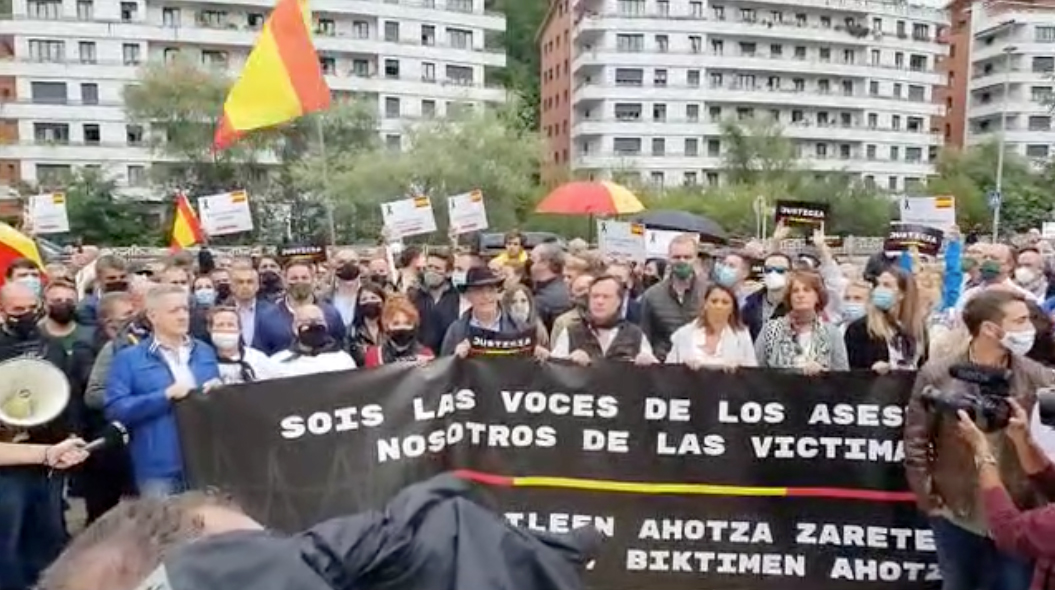 Emotivo homenaje a las 39 personas asesinadas por Henri Parot. El acto, convocado por Voces contra el terrorismo y apoyado por Vox en Mondragón, ha terminado con los acordes del himno nacional de España.