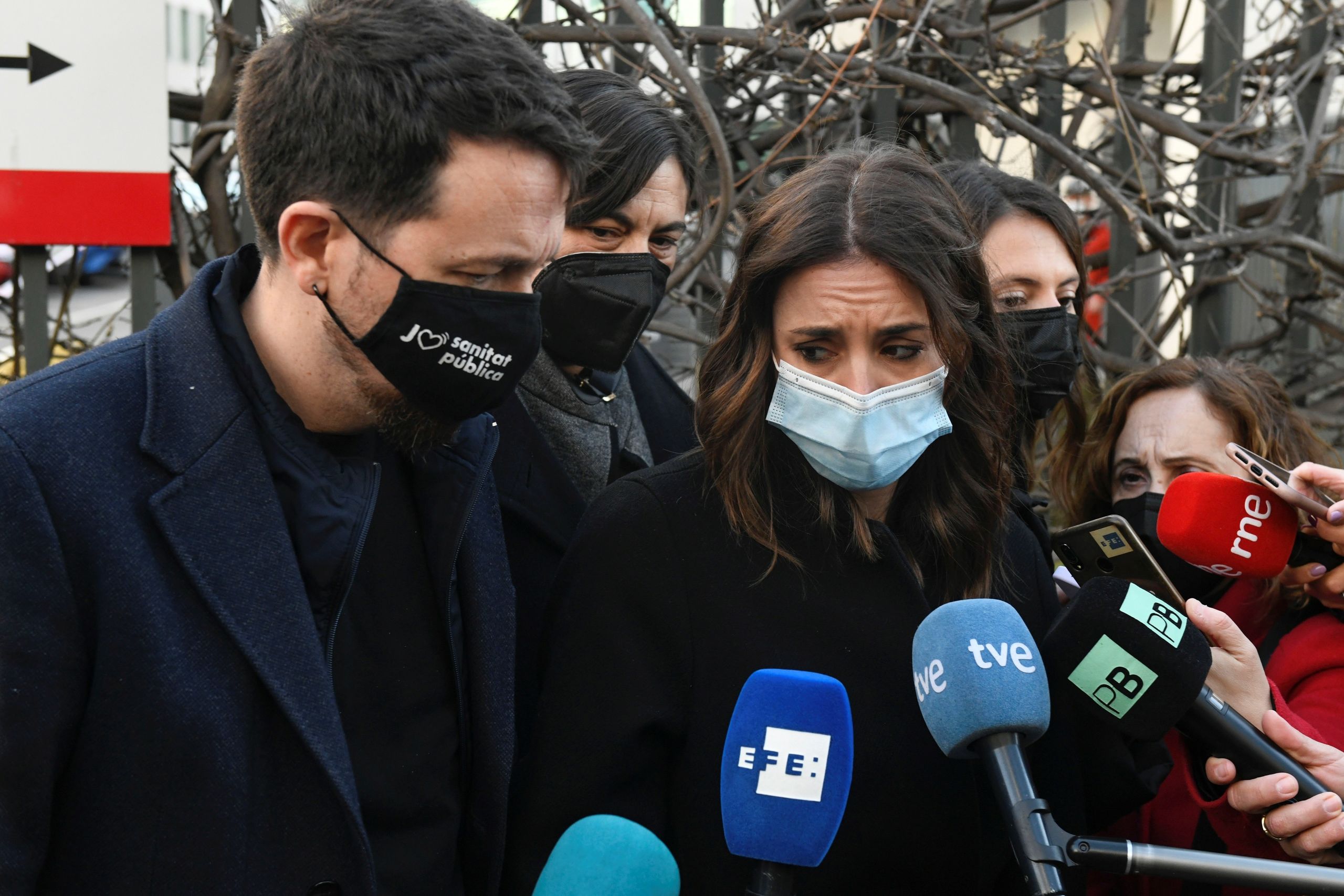 Iglesias, con un brazo sobre el hombro de Irene Montero a su llegada a los juzgados de Julián Camarillo en Madrid.