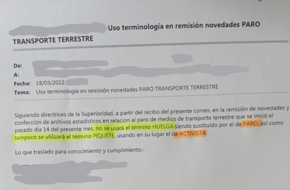 También se han remitido instrucciones a las Comandancias de la Guardia Civil para que se informe inmediatamente a las instituciones políticas "si se producen casos de detenidos, o de personas investigadas o heridos" y ha dado instrucciones muy claras sobre el uso del lenguaje. No podrán utilizar en informes o notas de prensa los términos "huelga" o "piquete" y deben emplear en su lugar "paro" o "activista".