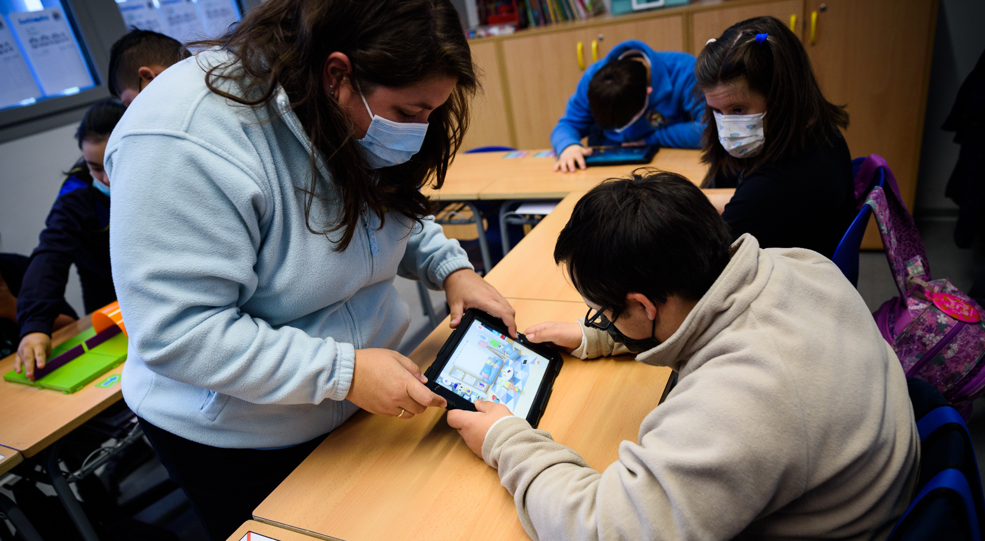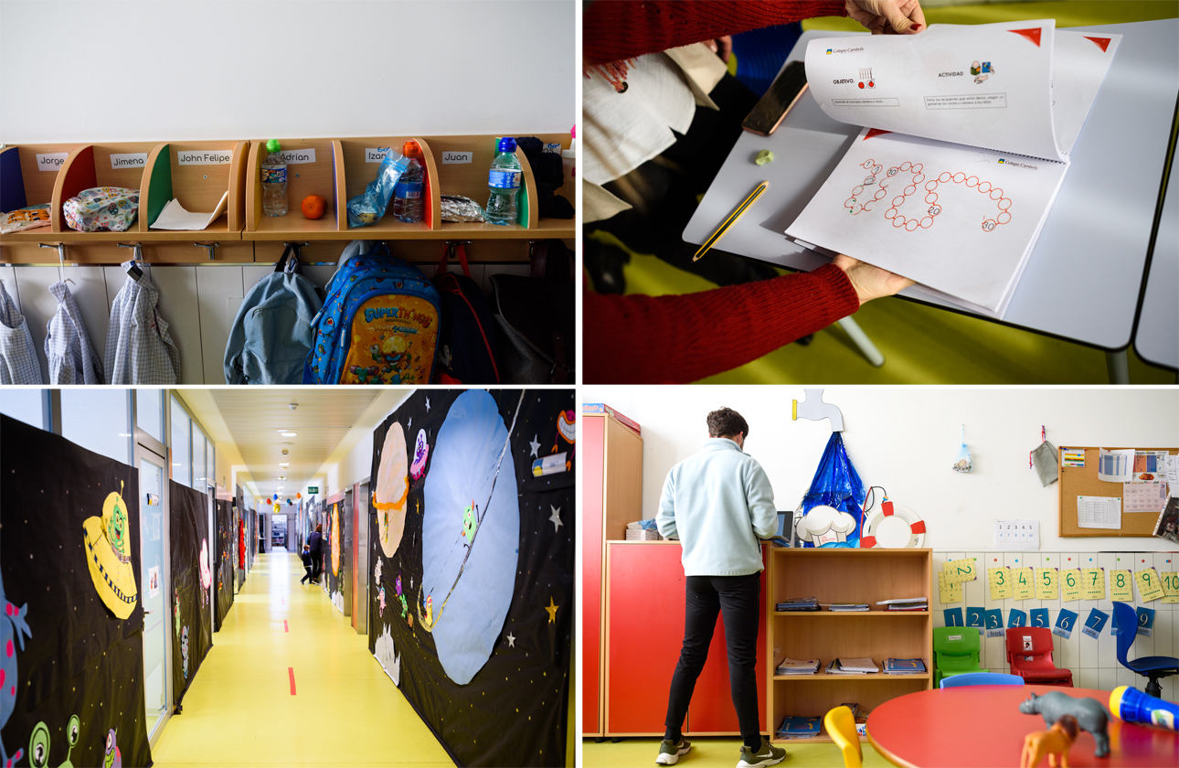Es hora de entrar a clase y a nosotros nos espera Laura, la directora del centro y la encargada de enseñarnos cómo funciona este colegio de educación especial ubicado en el madrileño barrio de Carabanchel desde 2015, pero creado en 1984 en un pequeño chalet de Mirasierra. Al principio, apenas eran unos pocos niños. Hoy, son 98 alumnos de entre 3 y 21 años repartidos en una clase de Educación Infantil, nueve de Educación Básica Obligatoria (EBO), una de Transición a la vida adulta y otra en la que se imparte un programa profesional de Sistemas microinformáticos.