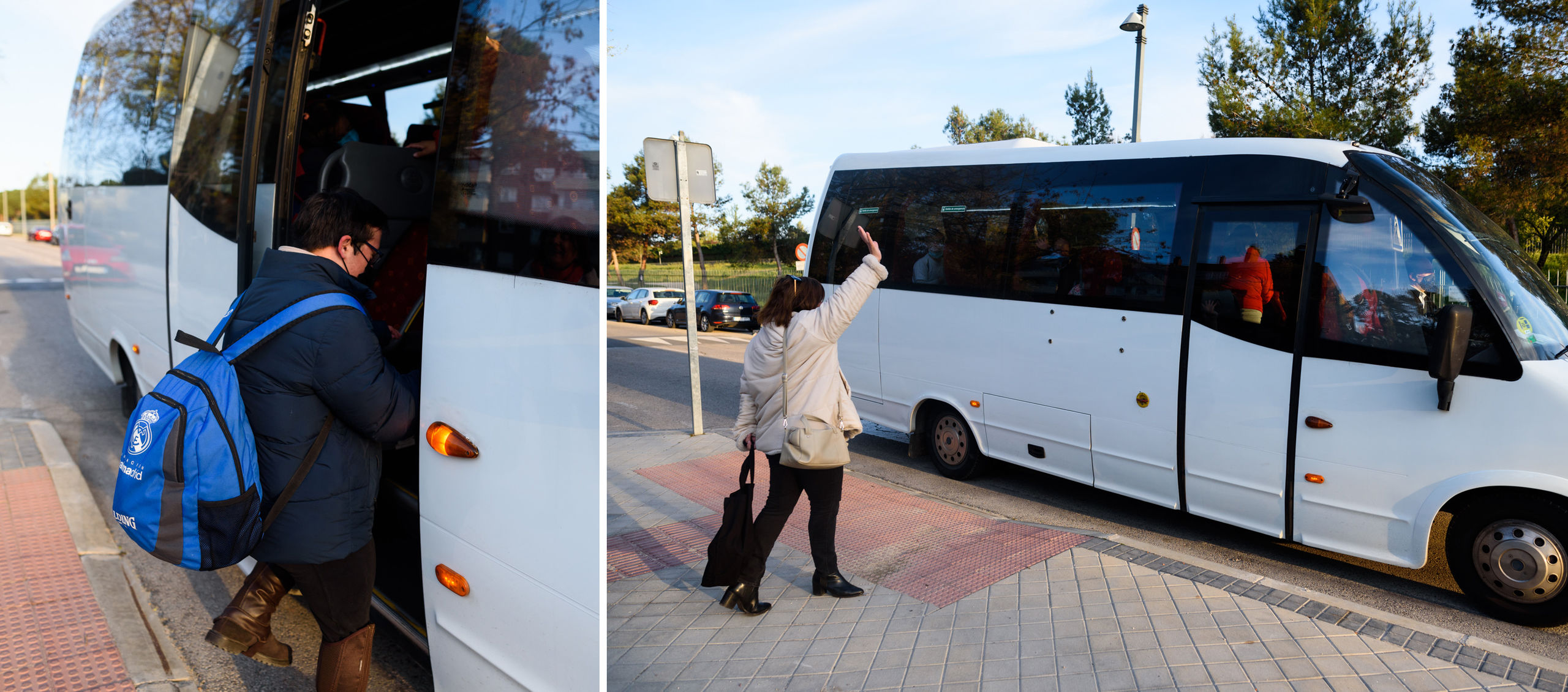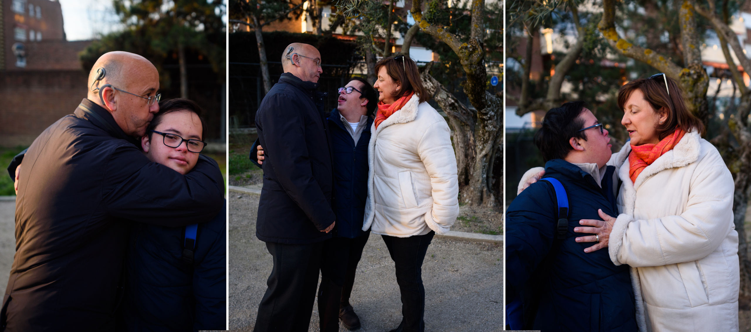 Inés y Javier, sus padres, le acompañan a coger la ruta que cada día le lleva hasta su cole. Ante los nervios, los abrazos y besos de su madre se convierten en su mejor refugio. "¿No vienes?", le pregunta al ver que le despide antes de subir al autobús. "Yo voy con ellos, pero luego te veo", le tranquiliza Inés, que se encarga de acompañarnos hasta el Colegio Cambrils, el centro de educación especial en el que Joaquín, que hoy ya tiene 16 años, aterrizó tras pasar por un centro ordinario y otro mixto.