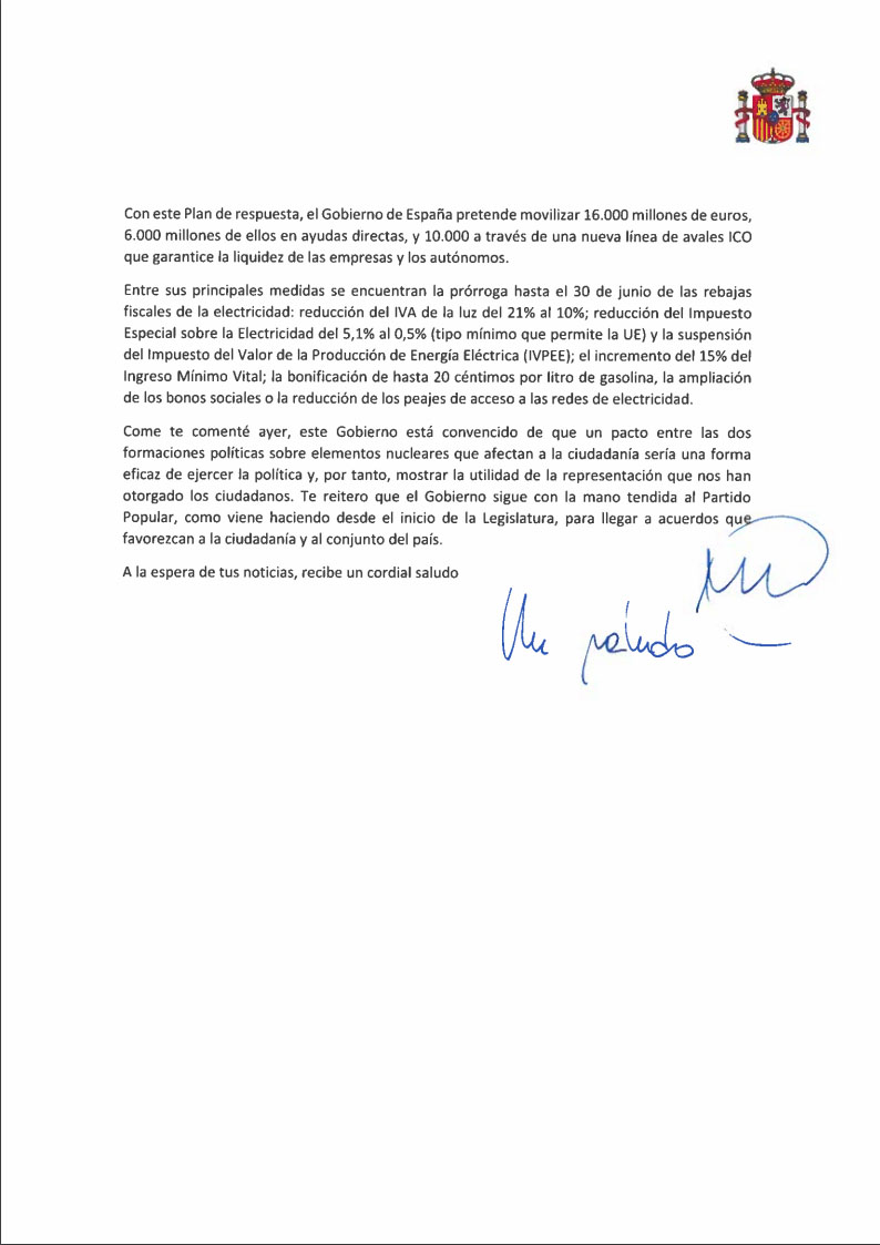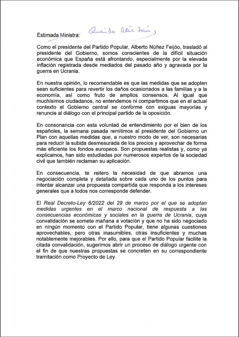Pero el PP no está dispuesto a "dar cheques en blanco". Tras esa llamada, el vicesecretario de Economía de Feijóo, Juan Bravo, le trasladó a Montero a través de una carta la voluntad del PP "de buscar puntos de encuentro y en ese ánimo constructivo y de cooperación". Para ello, desde pidieron "a cambio de facilitar la aprobación del decreto", la tramitación del "texto como proyecto de ley, que se comprometa por escrito el Ejecutivo a que sea en este periodo de sesiones, e incorpore los cuatro aspectos básicos que el PP establece para solucionar el problema económico que afronta el país: una rebaja de impuestos a las rentas medias y bajas, una bajada en el IVA para la electricidad de acuerdo con las normas comunitarias, una gestión eficiente de los fondos europeos y una reducción en el gasto burocrático y político del actual Gobierno".