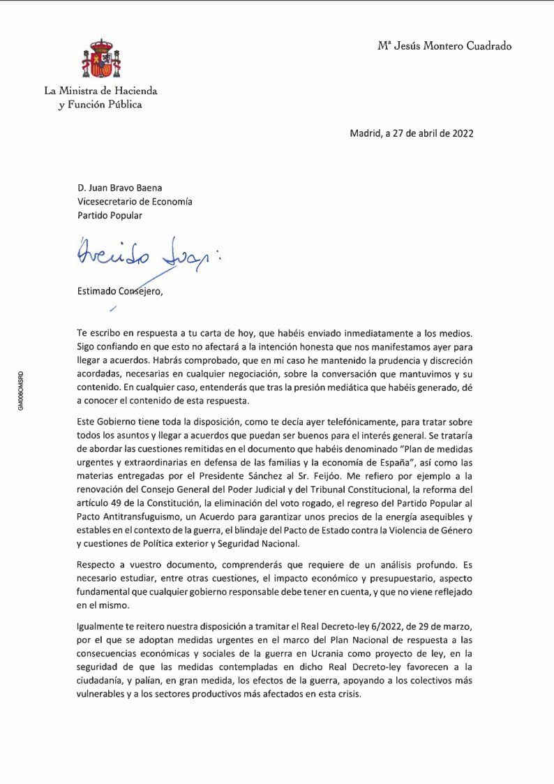 Tras la carta de Bravo, llegó la respuesta de María Jesús Montero también a través de una misiva. En ella, la titular de Hacienda confirma la disposición del Gobierno de tramitar el real decreto como ley como proyecto de ley y añade que existe la "convicción de que un pacto entre las dos formaciones políticas sobre elementos nucleares que afectan a la ciudadanía sería una forma eficaz de ejercer la política".