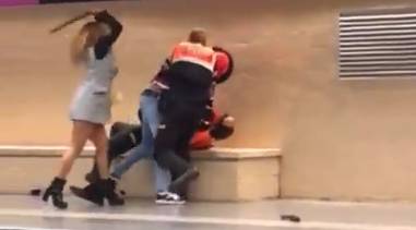 Los vigilantes se vieron sorprendidos por la violencia del grupo. Un par de sujetos lograron escapar mientras la mujer atacaba brutalmente a uno de los vigilantes dándole golpes en la cabeza con la porra que le había arrebatado. El vigilante y su compañero trataban de inmovilizar a uno de los hombres y la mujer se ensañó hasta que pudo ser reducida. El ataque fue grabado por numerosos pasajeros.