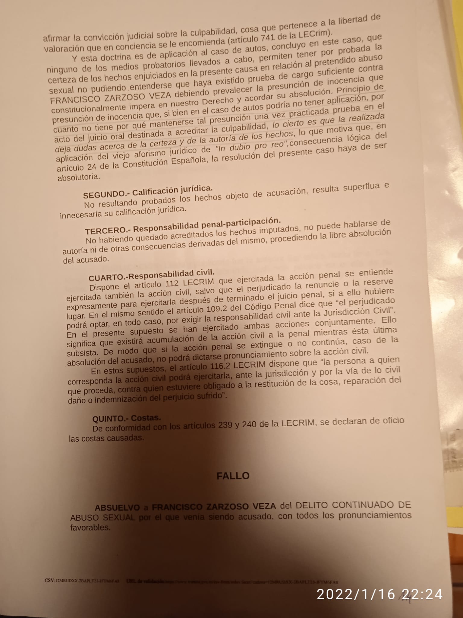 EsRadio ha tenido acceso a la sentencia en la que se absuelve a Francisco y en la que se constata que nunca hubo denuncia de esa menor a pesar de que se la instó a interponerla. De hecho, acabó reconociendo que los hechos no eran ciertos y la juez dio por vulnerado el derecho a la presunción de inocencia de Francisco.