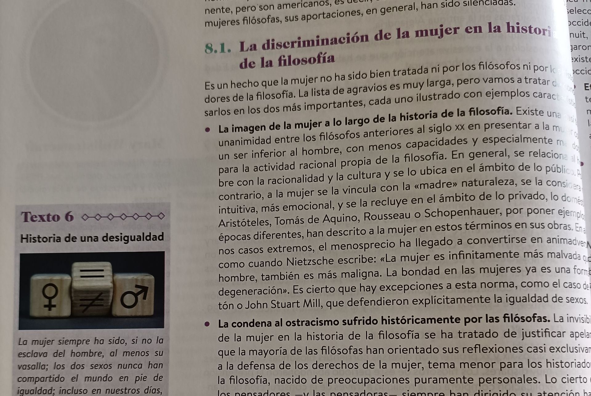 Un paso más en esta perspectiva de género se da en manuales como el de Filosofía de Oxford para primero de bachillerato. Incluye un apartado sobre la "discriminación de la mujer en la historia de la filosofía" que sentencia que "es un hecho que la mujer no ha sido bien tratada por los filósofos". El manual abronca a Aristóteles, Tomás de Aquino, Rousseau y Schopenhauer por vincular a la mujer "al ámbito de lo privado. "En algunos casos extremos, el menosprecio ha llegado a convertirse en animadversión", dice citando a Nietzsche. Salva a Platón y John Stuart Mil, "que defendieron explícitamente la igualdad de sexos". El volumen lamenta la "condena al ostracismo sufrido históricamente por las filósofas y señala que su invisibilidad "se ha tratado de justificar" por que la mayoría de ellas orientaron sus reflexiones "casi exclusivamente a la defensa de los derechos de la mujer, tema menor par los historiadores.