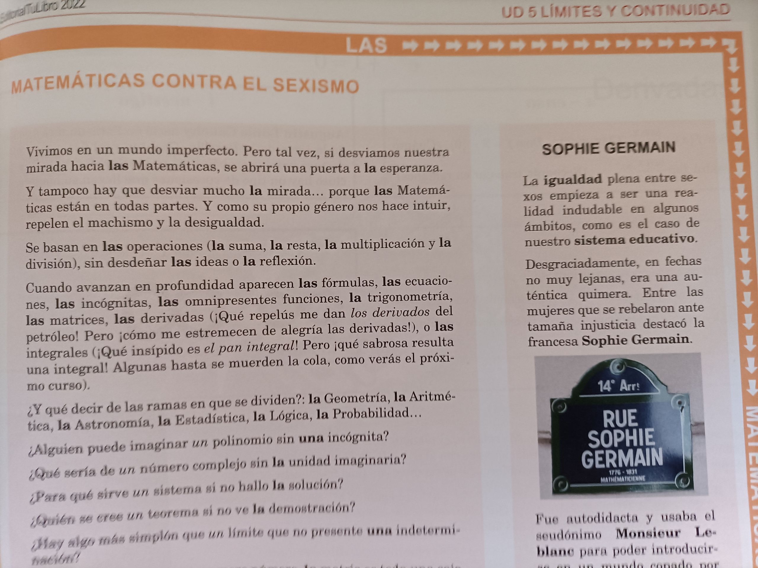 La asignatura de Matemáticas, según el decreto de Pilar Alegría, debía incorporar una "perspectiva social y emocional" y "desterrar" estereotipos de género. El difícil reto lo resuelve uno de los libros analizados, el de Matemáticas Aplicadas de la editorial Tu Libro, buscando la mención de mujeres matemáticas (como María Gaetana Agnesi o Sophie Germain) o incluso de poetisas: en una página dedicada a fórmulas estadísticas, se incluye un recuadro "para saber más" sobre la polaca Wislawa Szymborska, que escribió dos poemas "de índole matemática". En el apartado que en cada tema busca enseñar "la omnipresencia de las matemáticas", aparece un llamativo texto titulado "Matemáticas contra el sexismo": "Las matemáticas están en todas partes. Y como su propio género nos hace intuir, repelen el machismo y la desigualdad".