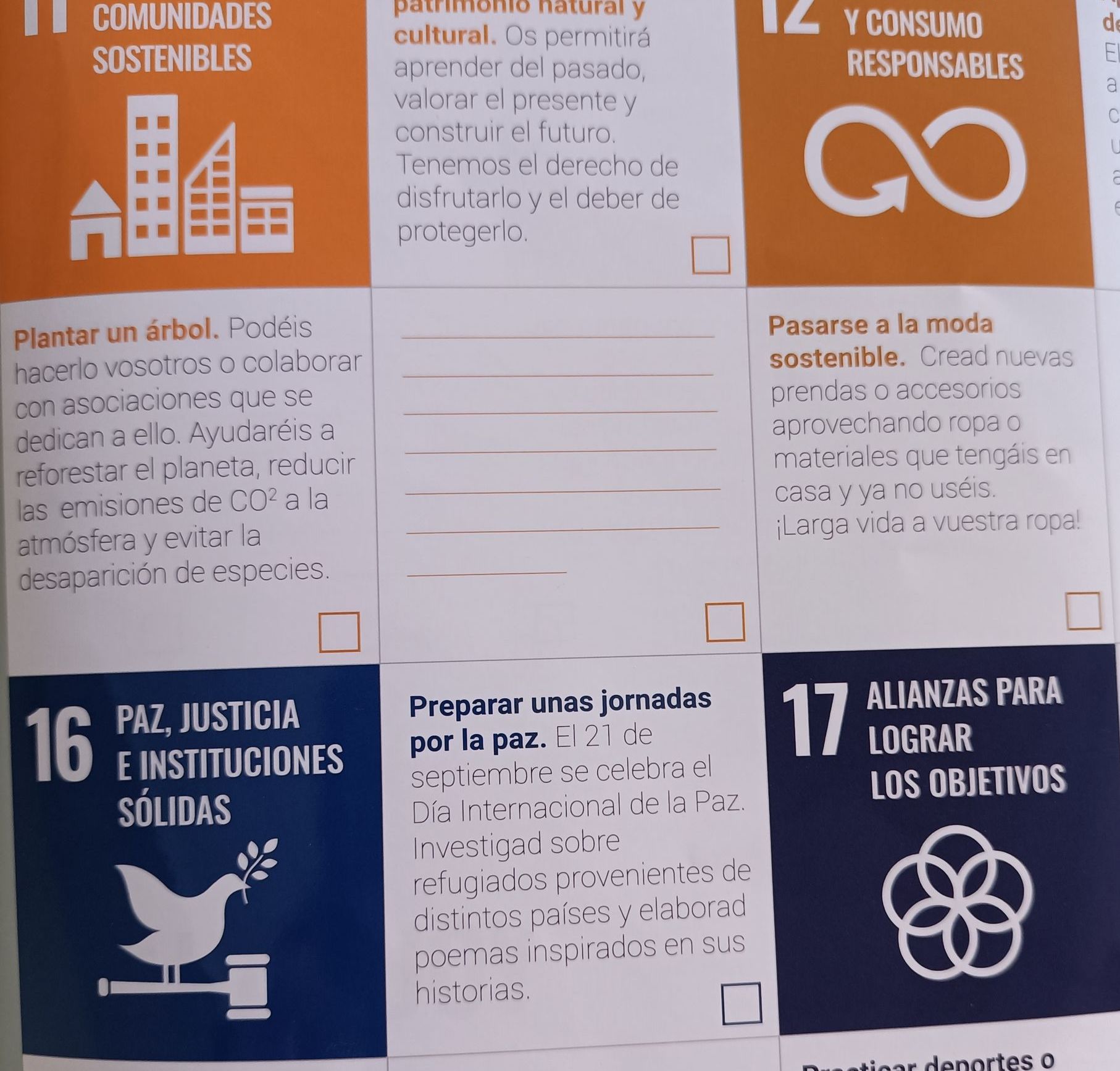 Entre las competencias del nuevo modelo educativo se incluye "el desarrollo de un estilo de vida sostenible acorde con los Objetivos de Desarrollo Sostenible planteados en la Agenda 2030". Los manuales lo traducen en una mención constante de dichos objetivos, a través de epígrafes, símbolos e incluso murales como el que propone la editorial Oxford para utilizar en clase. "¡Tú también puedes ser agente del cambio!", señalan incluyendo cada uno de los objetivos y propuestas para hacerlos realidad en la vida del alumno.