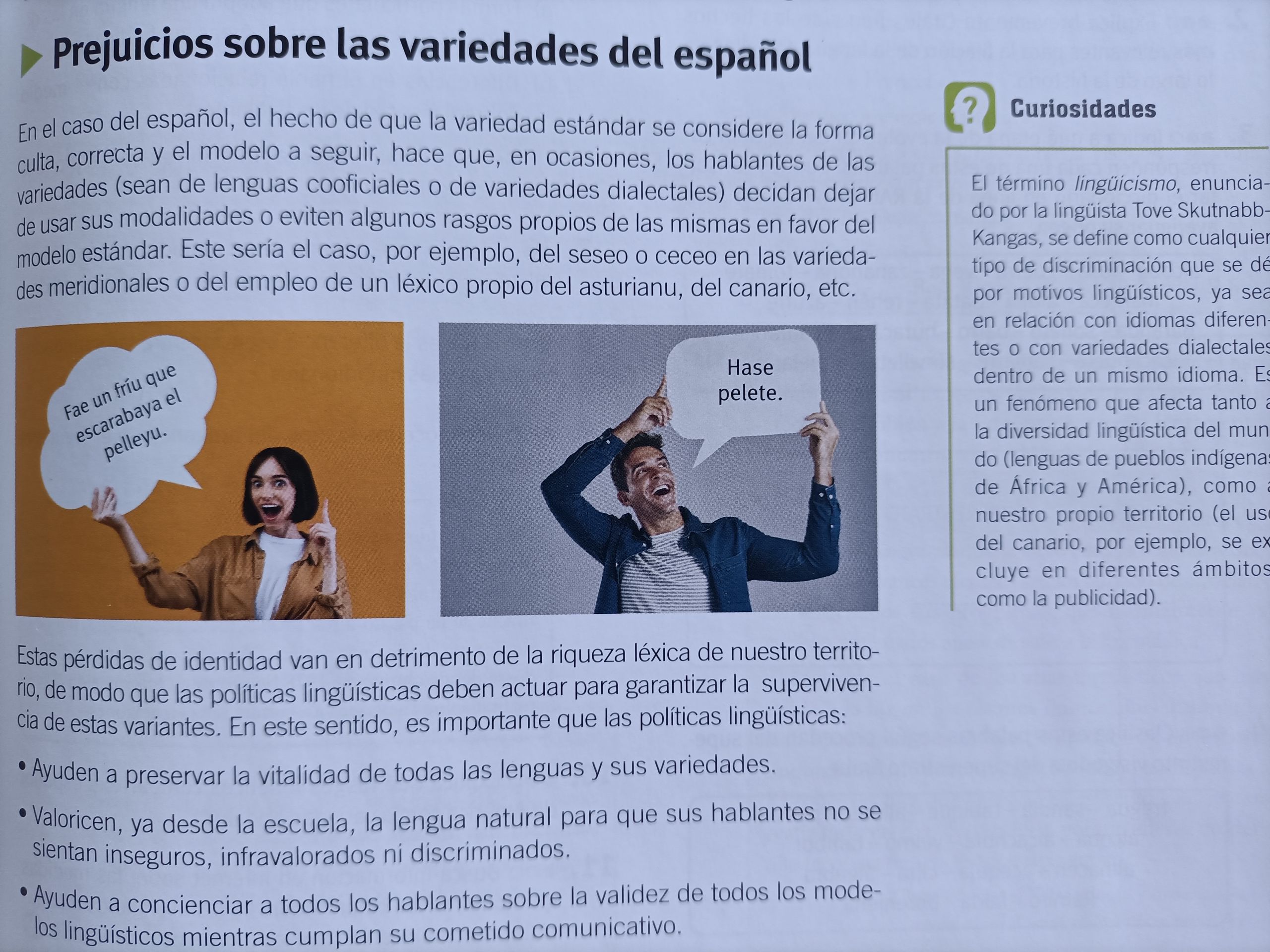 La primera competencia que menciona, de forma muy extensa, el currículo de Lengua y Literatura en Bachillerato es la referida a la "realidad plurilingüe y pluricultural" de España. La Lomloe pide "refutar los estereotipos y prejuicios lingüísticos" y así lo hace por ejemplo el manual de Edebé, que lamenta que "en el caso del español, el hecho de que la variedad estándar se considere la forma culta, correcta y el modelo a seguir, hace que, en ocasiones, los hablantes de las variedades decidan dejar de usar sus modalidades o eviten algunos rasgos propios en favor del modelo estándar". Citan el seseo, el ceceo o el léxico propio del "asturianu" o el canario.