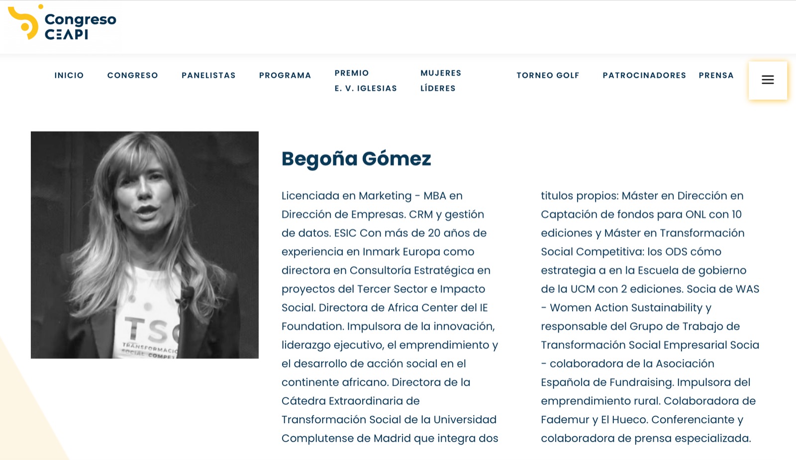Gómez añade, por último, que es socia de "WAS —Women Action Sustainability— y responsable del Grupo de Trabajo de Transformación Social Empresarial, socia-colaboradora de la Asociación Española de Fundraising. Impulsora del emprendimiento rural. Colaboradora de Fademur y El Hueco. Conferenciante y colaboradora de prensa especializada".