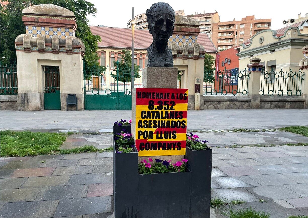 El busto del que fuera presidente de la Generalidad republicana Lluís Companys en la ciudad de Lérida ha amanecido con un cartel en el que se podía leer: "Homenaje a los 8.352 catalanes asesinados por Lluís Companys". La imagen se ha difundido a través de las redes sociales. Así, el diputado de Vox en el parlamento catalán Toni López ha sido una de las personas que se ha hecho eco de lo que en algunos medios se califica de "vandalismo" y "sabotaje", pero que no ha comportado ningún daño para el busto. En su mensaje, López afirma: "Ilerdenses pintan el busto del criminal Lluís Companys en homenaje a los más de 8.000 catalanes cuyas sentencias de muerte firmó. ¡Memoria y justicia!".