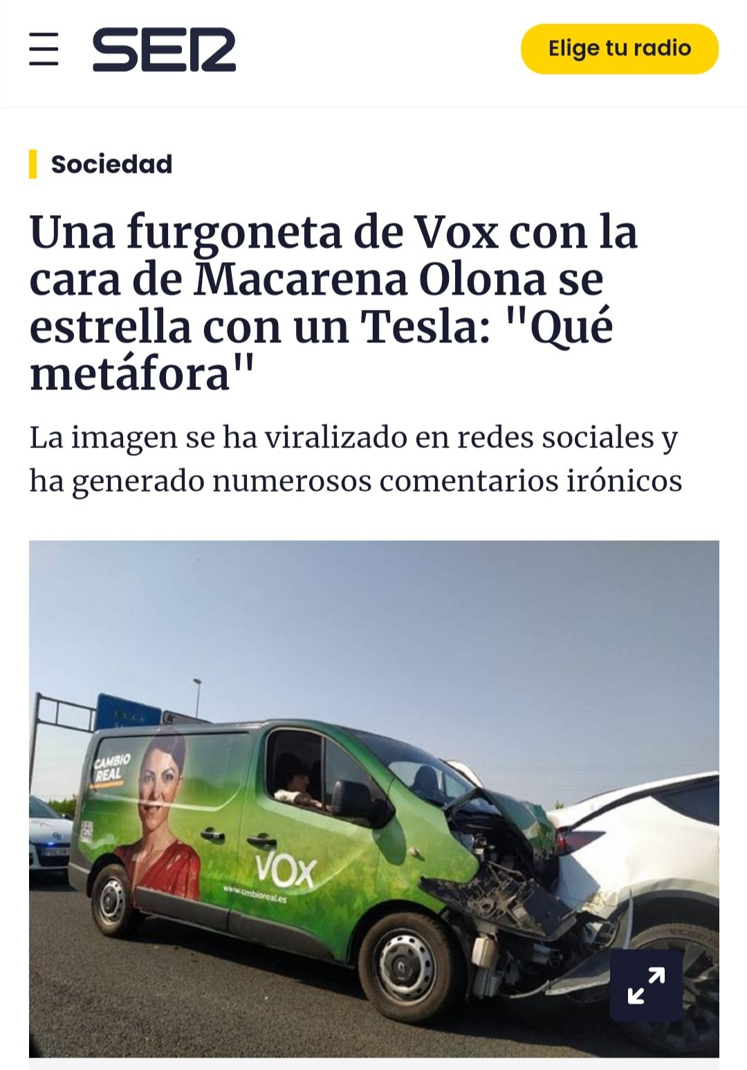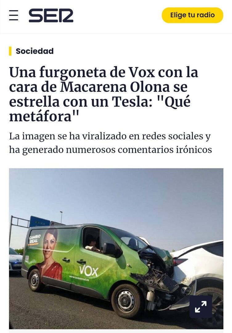 El líder de Vox, Santiago Abascal, ha contestado con dureza a la Cadena SER por el titular que eligió para hacerse eco de un accidente sufrido por la furgoneta electoral del partido en Andalucía. "Una furgoneta de Vox con la cara de Macarena Olona se estrella con un Tesla: "Qué metáfora".