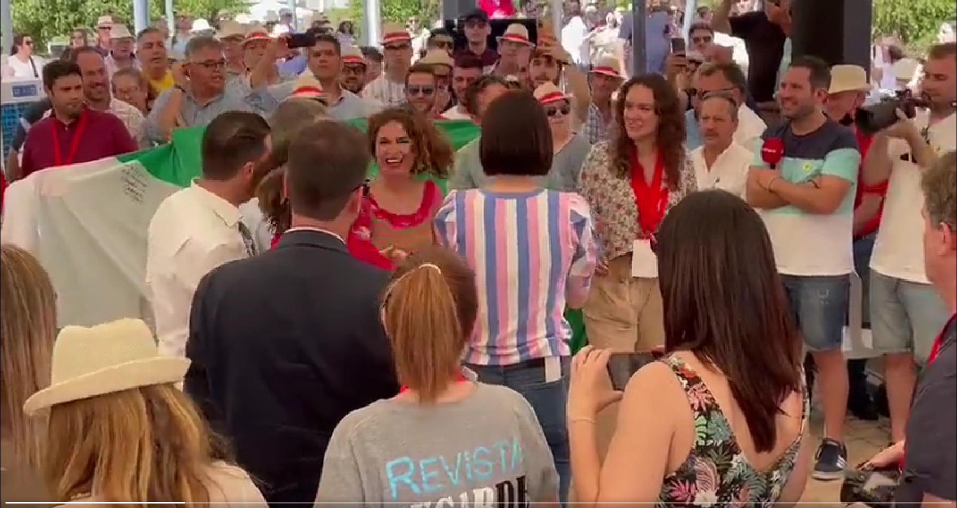 Sobre las 11:30 sonó la música del partido y el presentador anunciaba el comienzo del acto, al estilo de lo que haría un animador en un estadio de fútbol, una cancha de baloncesto o un pabellón donde se celebre una velada de boxeo. Entre otras cosas, la organización había preparado un paseíllo por el que iban pasando los dirigentes locales, provinciales, autonómicos y federales, además de las ministras María Jesús Montero y Diana Morant. Y la ministra de Hacienda se ha venido literalmente arriba: