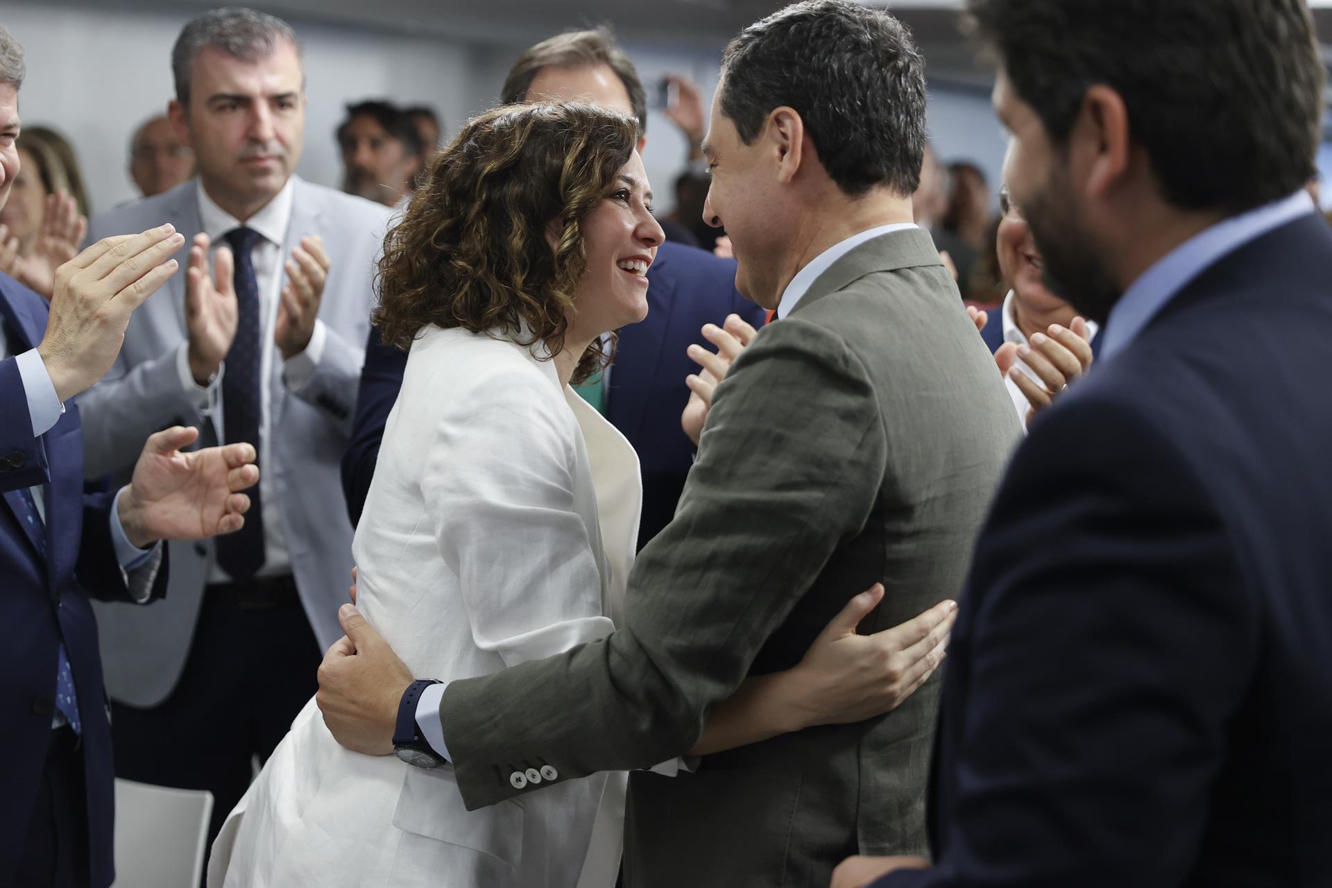 "Nos fijamos en los mejores y por eso pongo de referencia, como el resto de presidentes autonómicos a la Comunidad de Madrid, que es la locomotora económica y social de España. Queremos competir con Madrid, en el buen sentido, querida Isabel", ha afirmado Juanma Moreno. "Ya me he enterado de que vas a Miami a captar empresas. Ya iré yo por detrás allí para robarte alguna, ya iré yo. Como buena presidenta que es, va donde tiene que ir", ha dicho en alusión al futuro viaje de la líder del PP de Madrid. De ella, ha añadido que es "inteligente" y va a captar esas empresas de Iberoamérica que están huyendo por "los populismos de izquierda" y buscan ubicaciones seguras y estables.