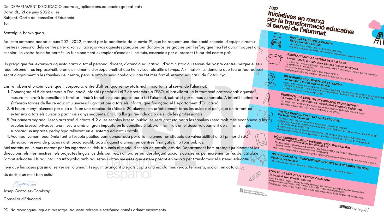 En la carta, González Cambray también anuncia que las clases comenzarán el próximo curso a partir del 5 de septiembre y que se tratará de reducir el número de alumnos por clase y concluye de esta forma: "Hagamos que las cosas pasen al servicio del alumnado. Y seguimos avanzando juntos hacia una escuela más verde, feminista, social y en catalán".