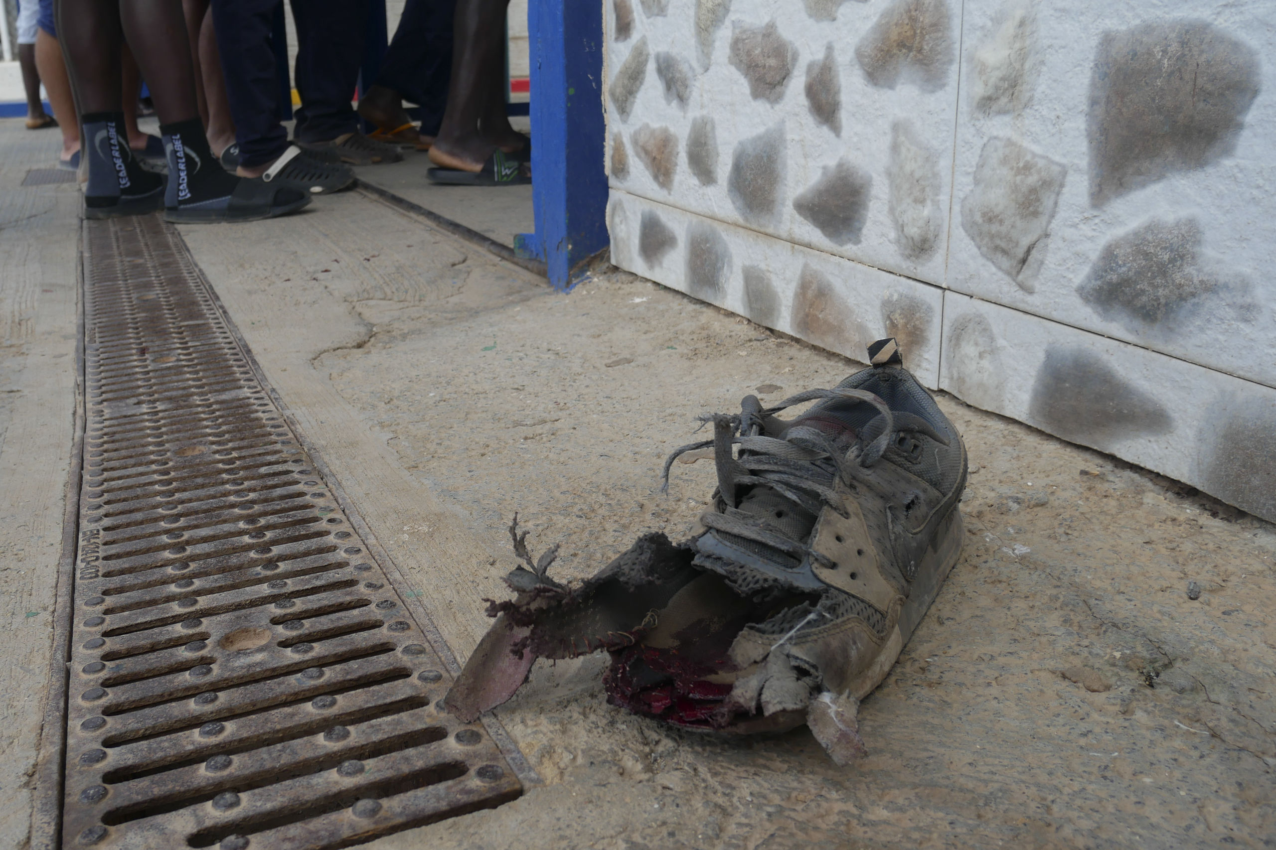 Una de las zapatillas destrozada y ensangrentada en el asalto, en el que los inmigrantes iban armados con palos, mazos y una radial.