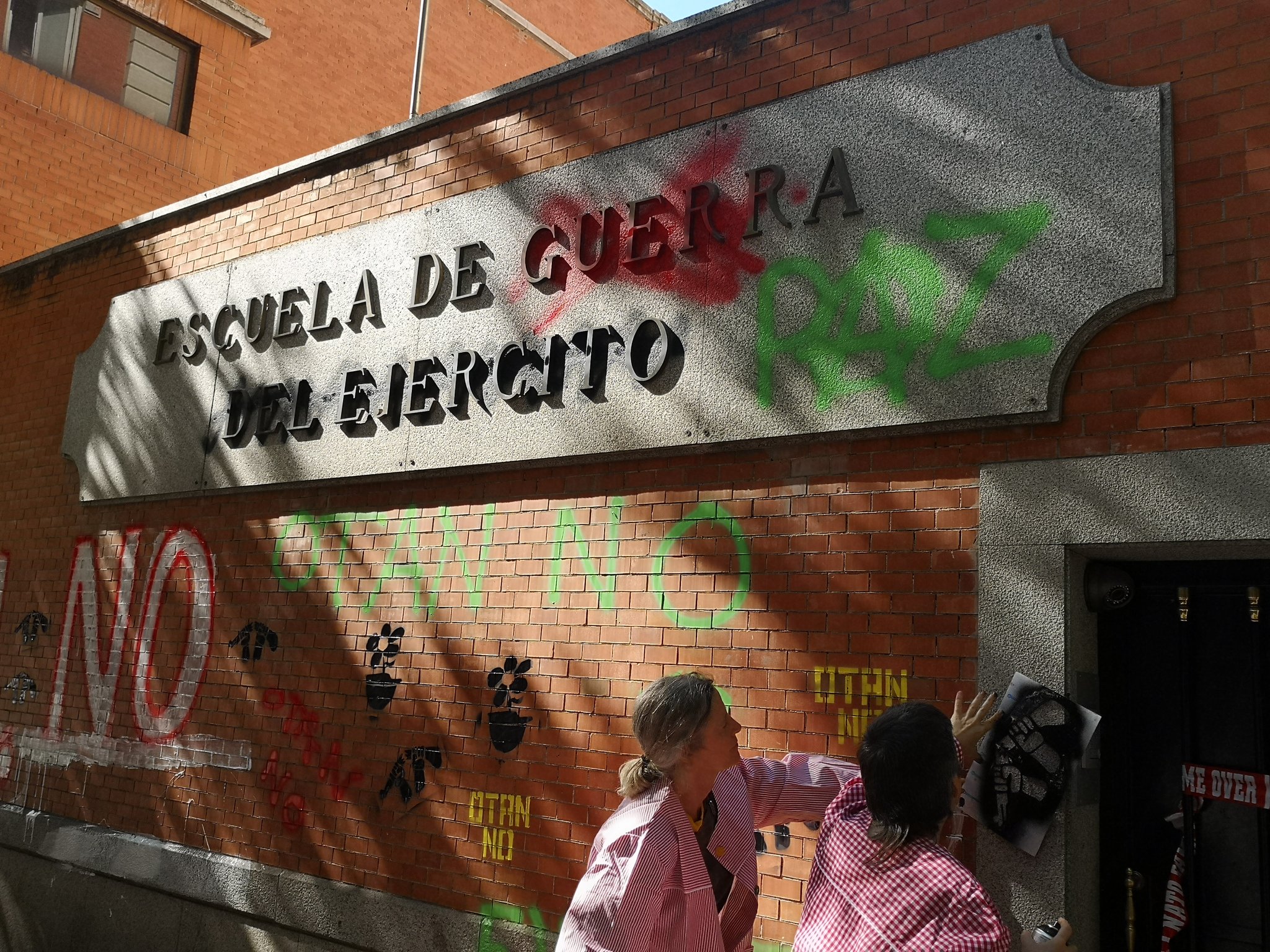En las paredes del centro de formación militar han pintado mensajes en contra de la Alianza Atlántica, otros con tintes pacifistas e, incluso, han tachado la palabra "guerra" de la placa que hay junto a la entrada principal para sobreescribir encima la palabra "paz". También han lanzado proclamas acusando a la OTAN de ser "señores de la guerra" y denunciando los supuestos "asesinatos" que tuvieron lugar en el vallado de Melilla.